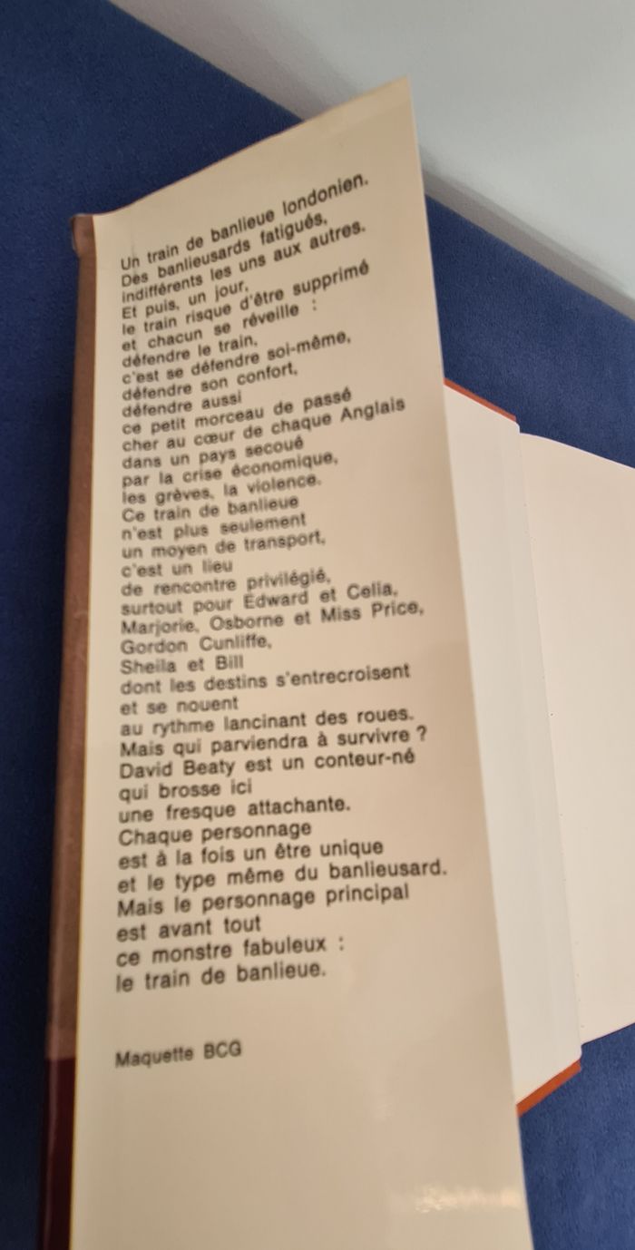 Train de Banlieue Auteur : David Beaty Edition France Loisirs Livre relié, couverture toile orange protégée par une jaquette en papier glacé. Format 20.5 x 13.5 Globalement très bon état pas de page cornée, ni d'annotations. A noter jaquette un peu abimée sur les bords et tranche avec marques du temps Lors de la lecture utilisation de marque-page. #roman #société #traindebanlieue #tdavidbeaty #franceloisirs #livrerelié #mar-taylivre
