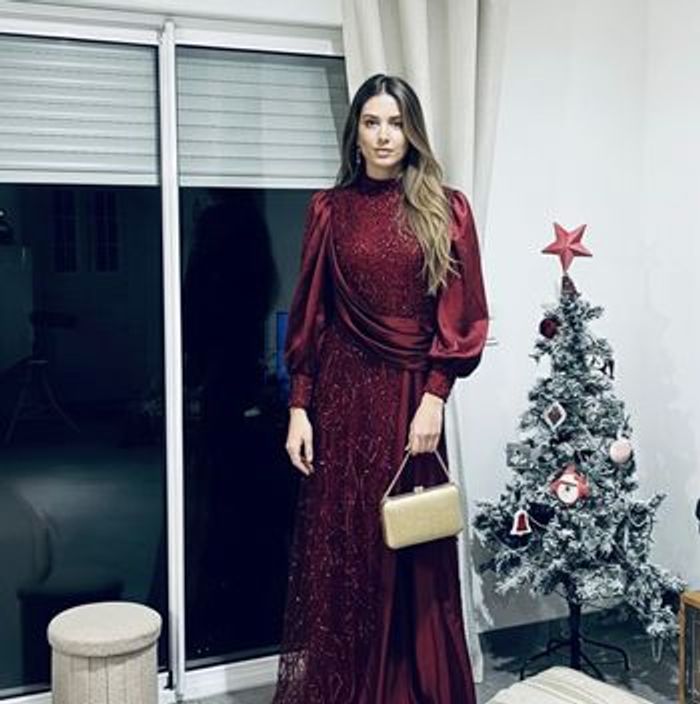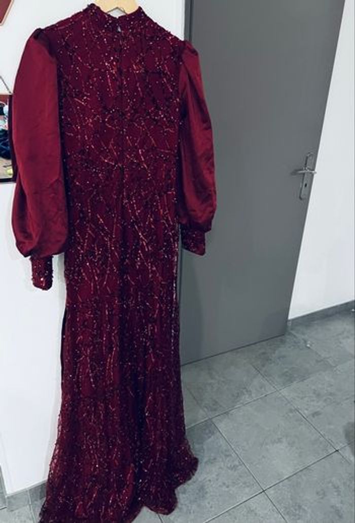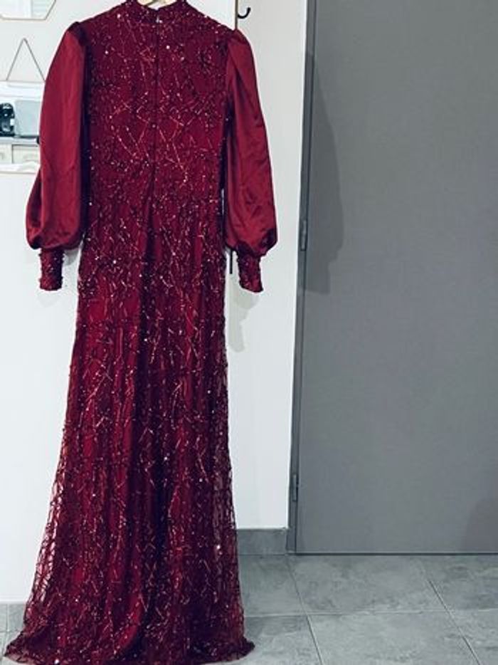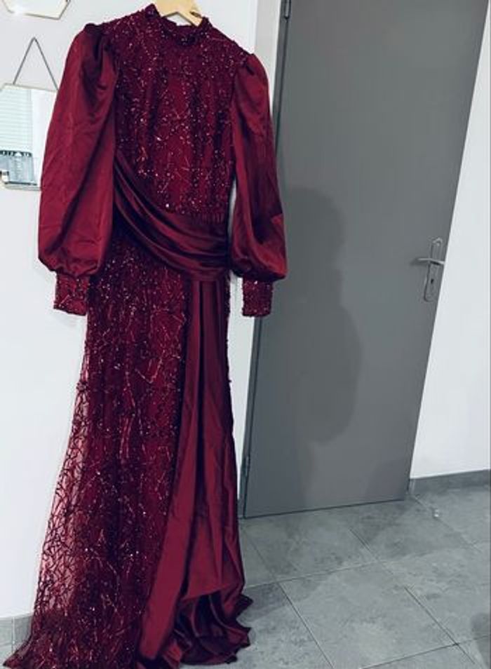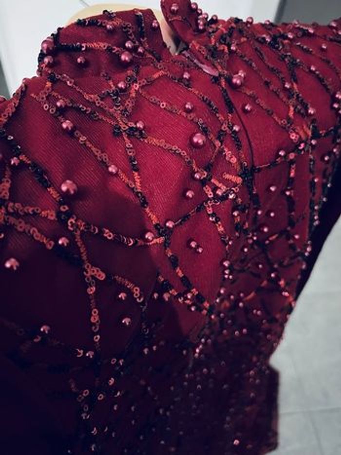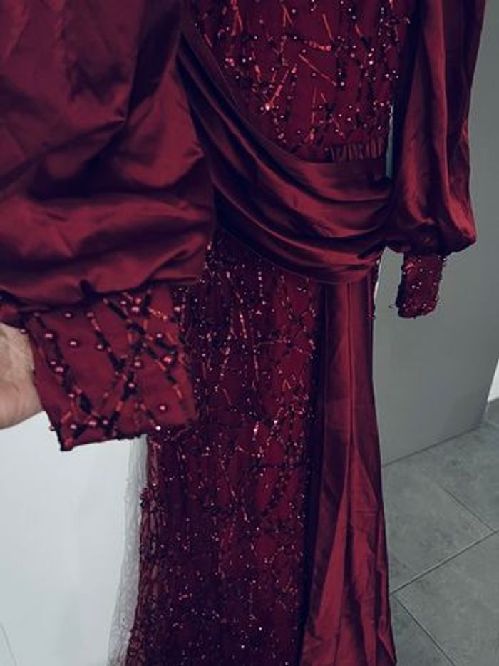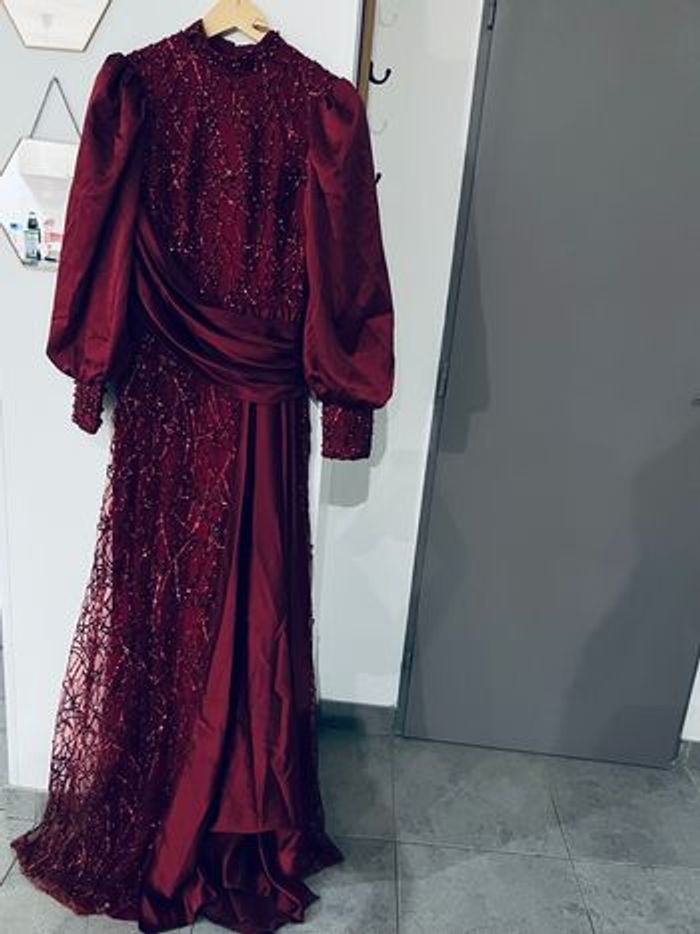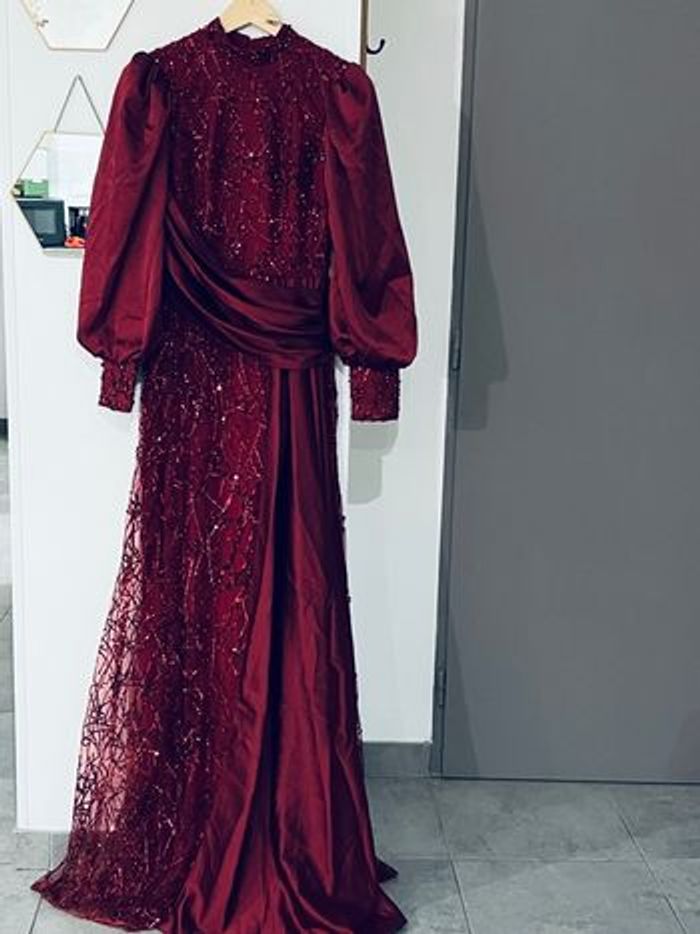 Cette robe est d'une couleur rouge foncée élégante, ornée de détails scintillants qui ajoutent une touche de sophistication. Les manches bouffantes et le drapé sur la taille lui confèrent une silhouette unique et romantique. Elle semble appropriée pour des occasions formelles, comme des soirées ou des événements spéciaux. Les embellissements et la texture du tissu contribuent à son allure chic. Si tu recherches un style glamour, elle pourrait être un excellent choix ! Prix 200€ Neuve Made in turque Boutique glamour fashion
