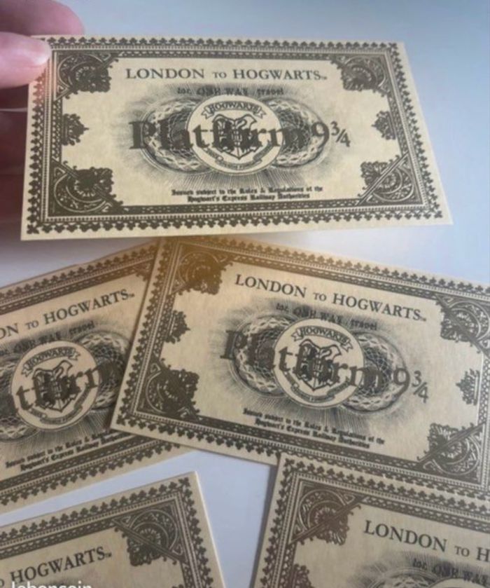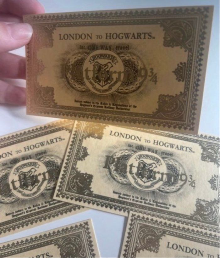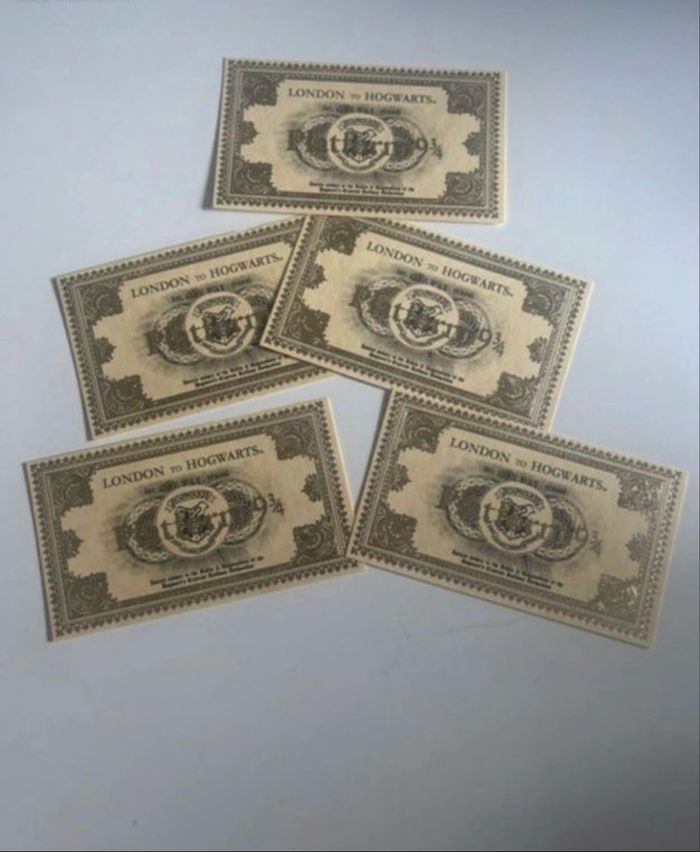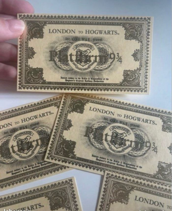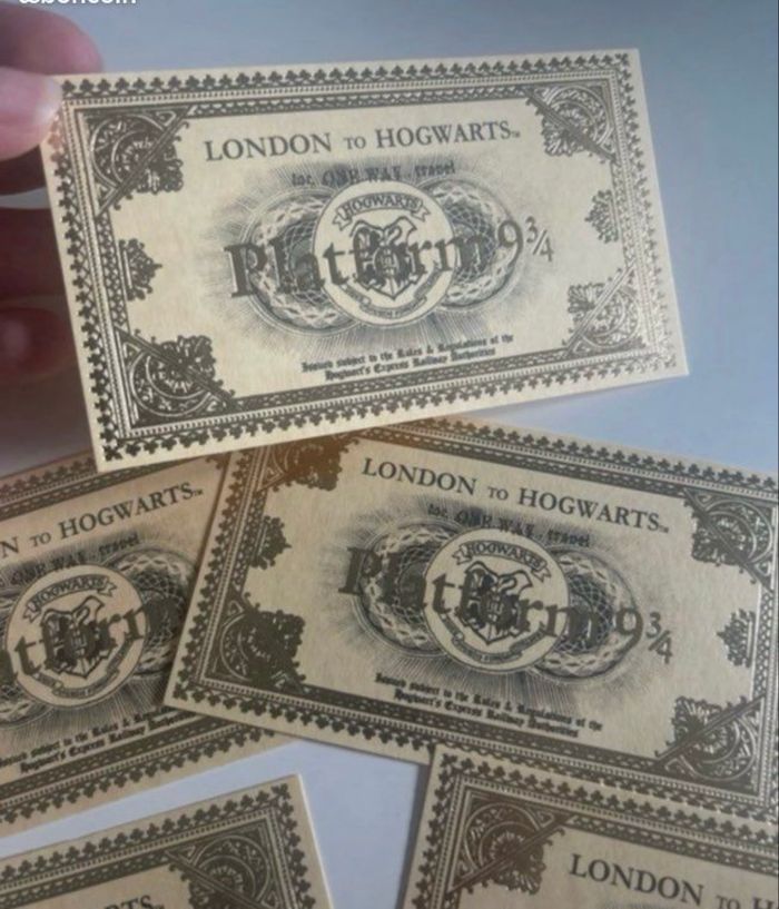 DRESSING PROPOSANT RÉDUCTIONS 💶😀 Lot de 5 tickets de train 🚂 de la gare du quai 9 3/4 : Londres pour Poudlard - London to Hogwarts. Tickets de la célèbre saga Harry POTTER. Couleur : Doré ✨NEUFS.✨ Prix : 3€75 Je dépose DANS LA MESURE DU POSSIBLE les colis 📦 le lendemain du paiement. 😉 MAIS SI CEST UN ENVOI URGENT, MERCI DE ME LE PRÉCISER ☺️. N’hésitez pas à jeter un coup d’👀 à mes évaluations. 🙂