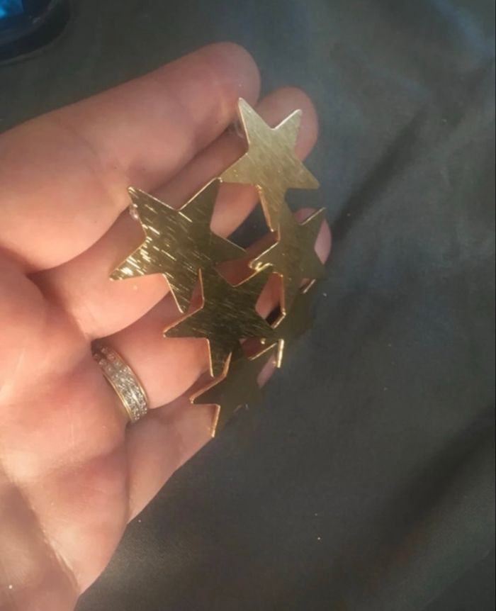 DRESSING PROPOSANT RÉDUCTIONS 💶😀 Boucles d’oreilles pendantes pour femme, en forme d’étoiles ⭐️. Pour oreilles percées. Couleur : Doré TRÈS LÉGÈRES ✨NEUVES. Jamais portées.✨ Prix : 3€00 Je dépose DANS LA MESURE DU POSSIBLE les colis 📦 le lendemain du paiement. 😉 MAIS SI CEST UN ENVOI URGENT, MERCI DE ME LE PRÉCISER ☺️. N’hésitez pas à jeter un coup d’👀 à mes évaluations. 🙂