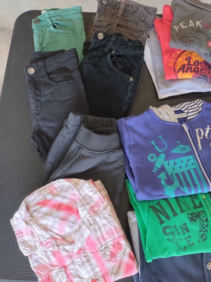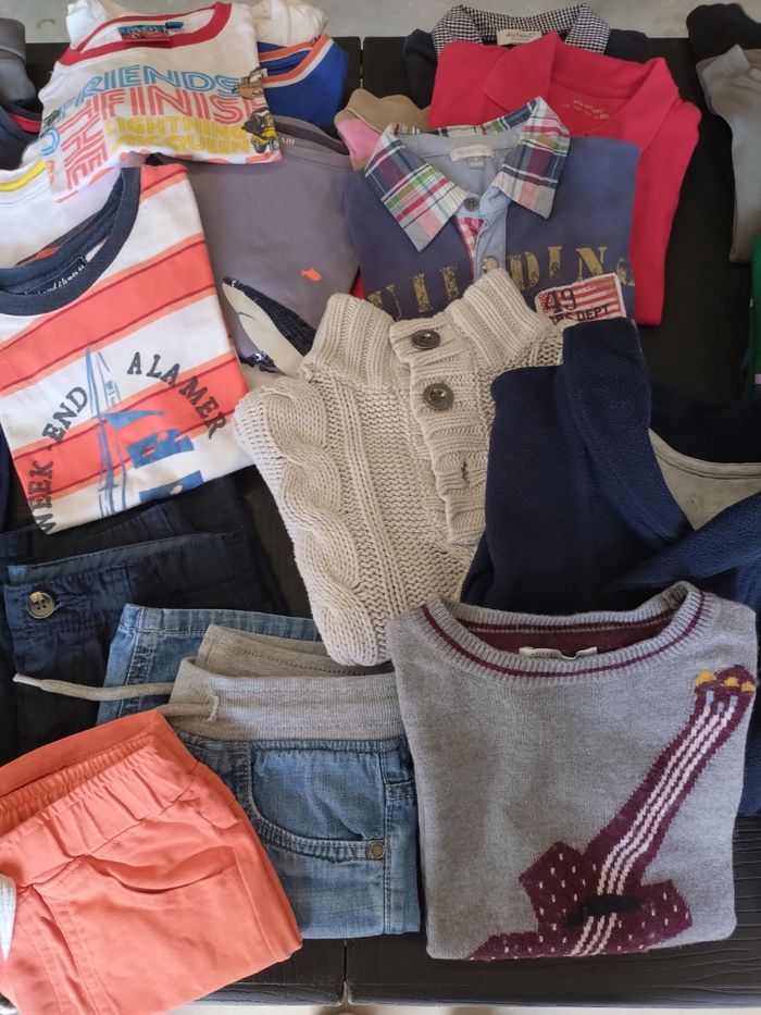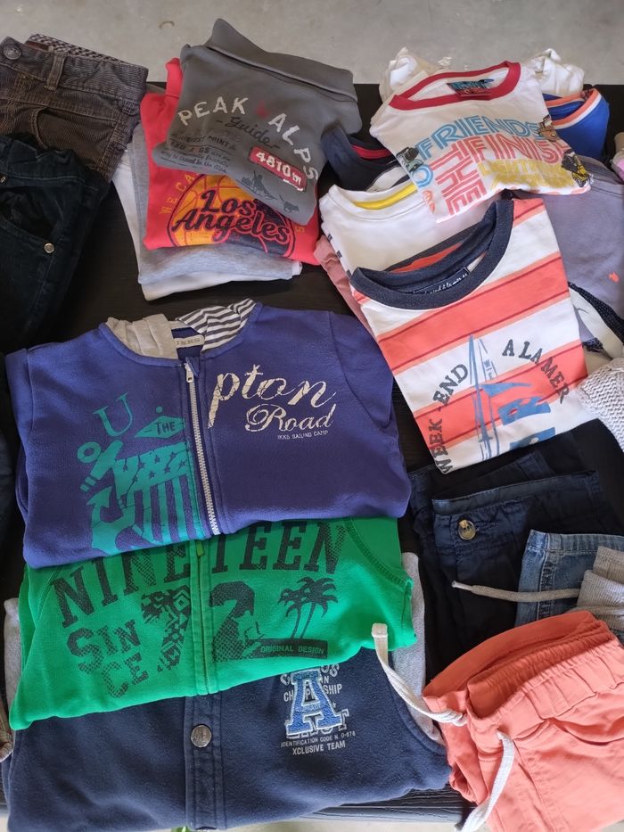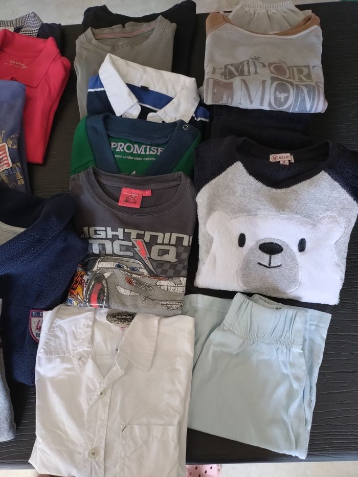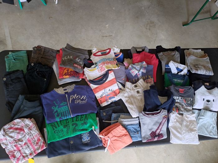 Lot vêtements garçon 4 ans toutes marques confondues. 5 pantalons 3 pulls 4 cols roulés 5 polos manches longues 2 pyjamas 1 short pyjama 1 chemise manches courtes 3 gilets 3 shorts 4 polos manches courtes 5 tee-shirt blancs 10 tee-shirt