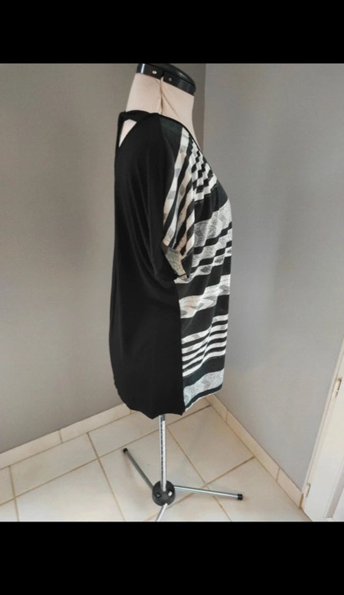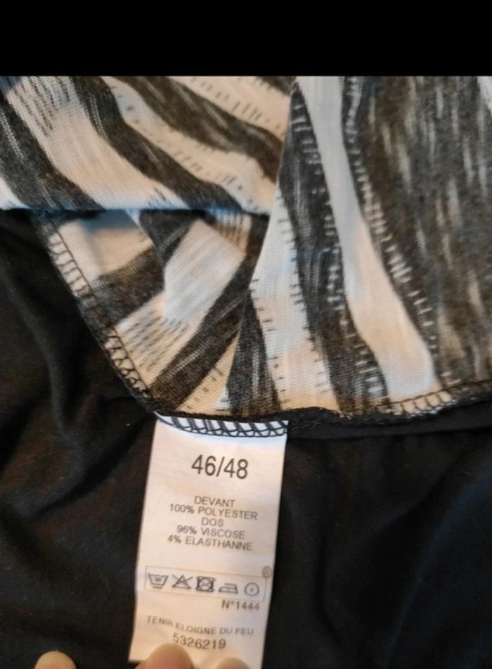 Tee-shirt noir et gris avec jolie finition dans le dos. Impossible de mesurer la largeur d'épaule, j'ai mis la largeur totale comme sur la dernière photo, pour info le mannequin est réglé sur une largeur d'épaule de 41cm. Longueur 65 cm Polyester, viscose, elasthane. Poids 152 gr #olinafemme46XXXL