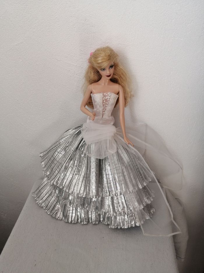 poupée barbie holiday collector 20ème anniversaire 2008 N° 1748 1 bras fléchi marquée au cou 1991 mattel marquée sur fesses 2005 indonesia 30 cm vendue comme sur les photos avec 2 tenues + accessoires à noter que les cheveux peuvent avoir été coupé peut présenter des traces du temps, robe blanc/gris légèrement décousue #poupees_maxtybroc