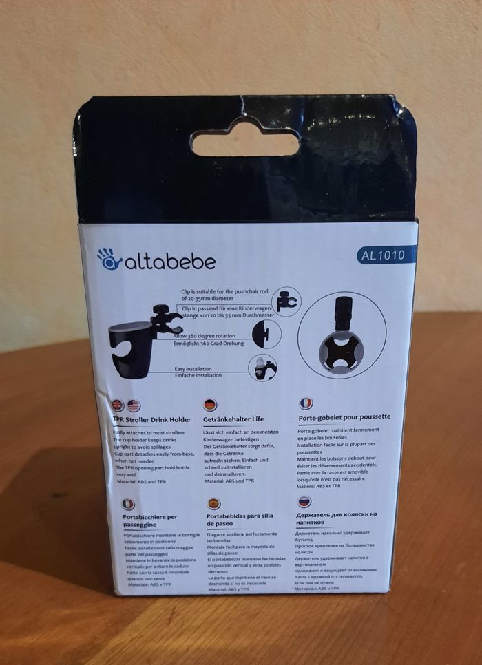 Porte gobelet ou biberon neuf, s'accroche à une poussette, un landau, ... marque Altabebe porte gobelet maintient fermement en place les bouteilles, les biberons pour éviter qu'ils ne se renversent installation facile dimension : Longueur 16 cm x largeur 16 cm x hauteur 9 cm