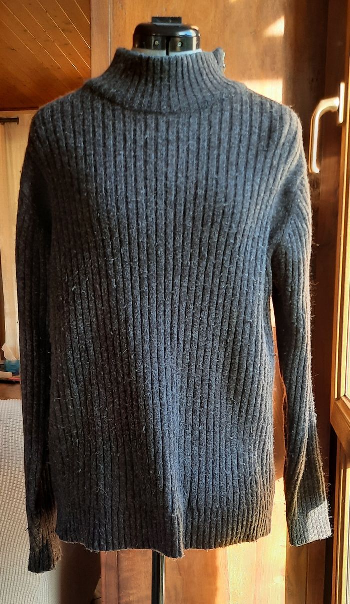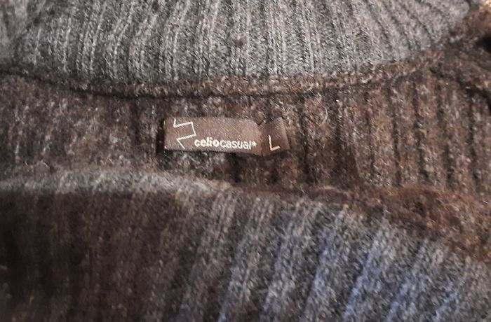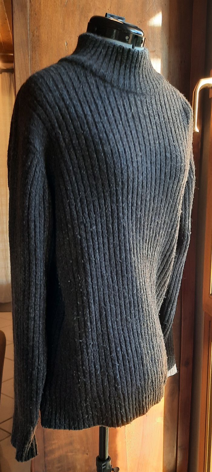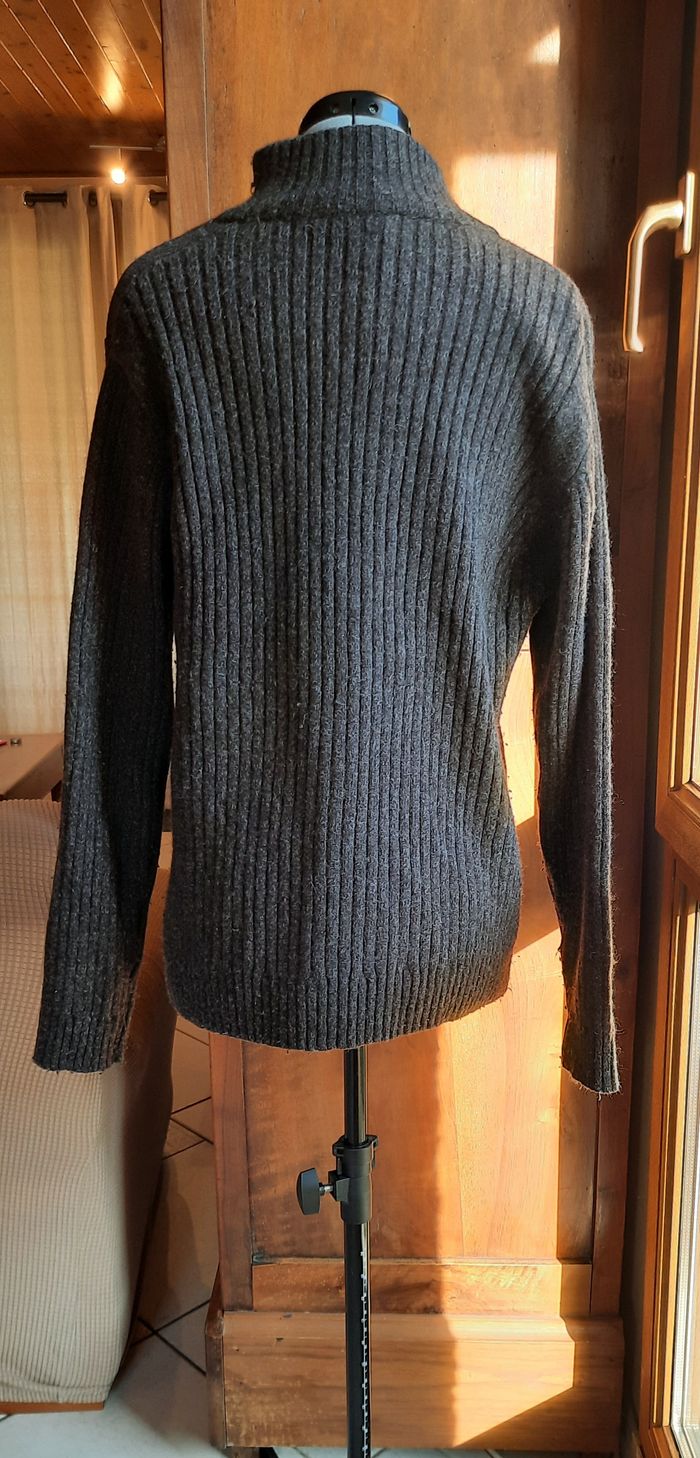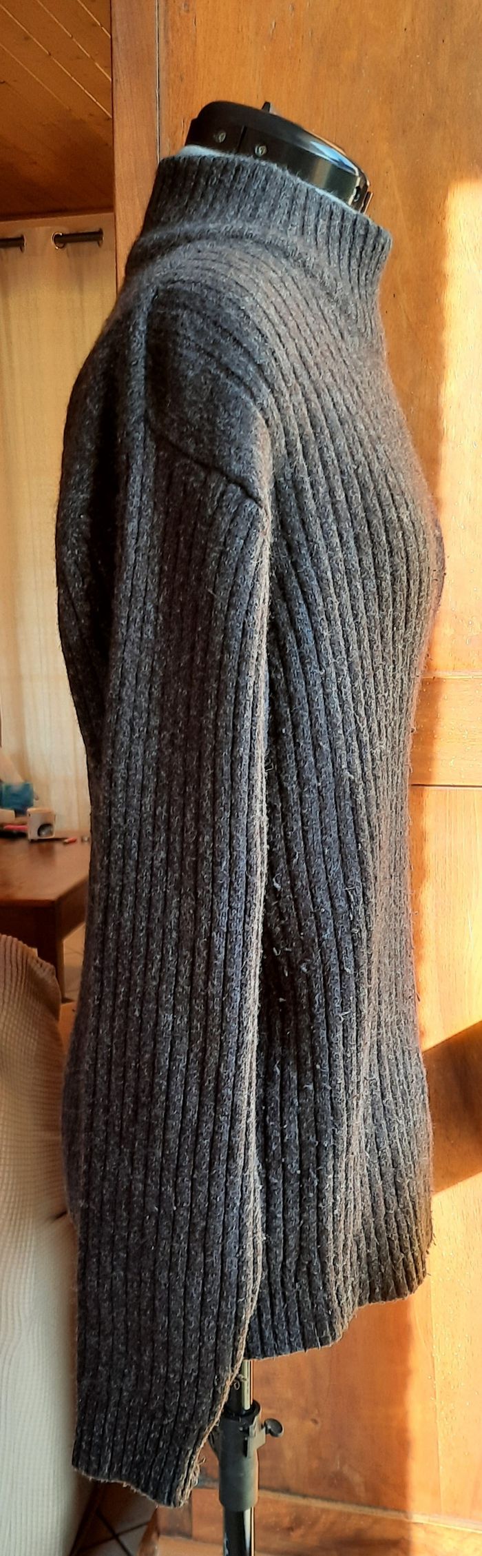 Pull marron, homme, Celio, taille L pull col montant, zip sur l'épaule 80 % laine d'agneau et 20 % polyamide Largeur d'épaule : 48 cm Largeur sous les aisselles : 52 cm Hauteur : 70 cm Etat correct : pull avec des peluches