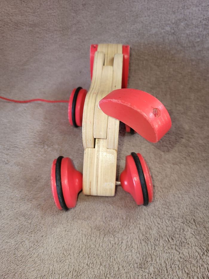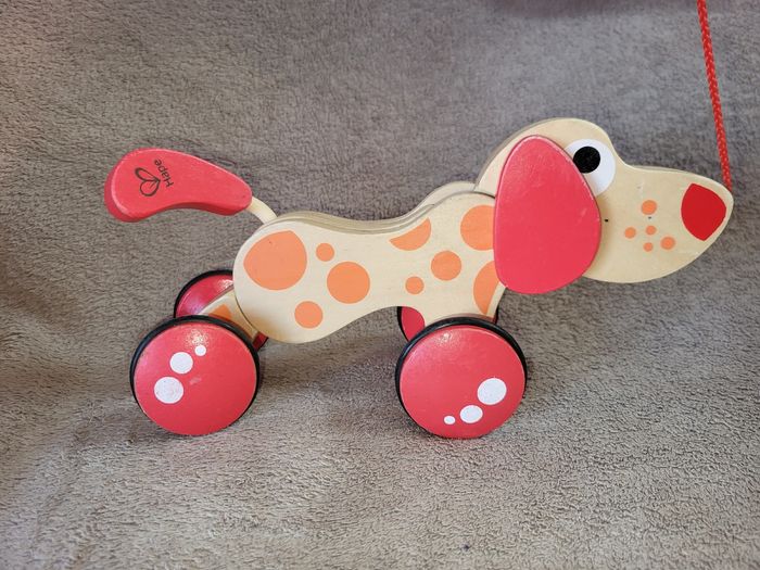 Chien à tirer en bois Puppy Roues silencieuses Quelques traces d'usure, la peinture s'estompe par endroits Chien Puppy Assis, debout, roule… Apprends de nouveaux mouvements à Puppy le chien ! Ce jouet stimule la coordination physique, l’équilibre et l’imagination des enfants. Avec sa queue qui remue et sa tête toute mignonne, Puppy le chien rend l’apprentissage de la marche très amusant : c’est le compagnon idéal pour apprendre à faire ses premiers pas. Puppy le chien à promener renforce également la confiance en soi des enfants, dès 12 mois, et développe la motricité globale. #virgy61puericulture