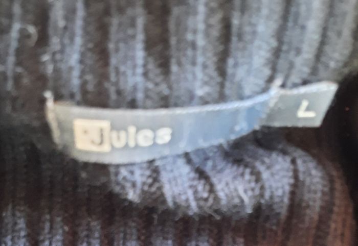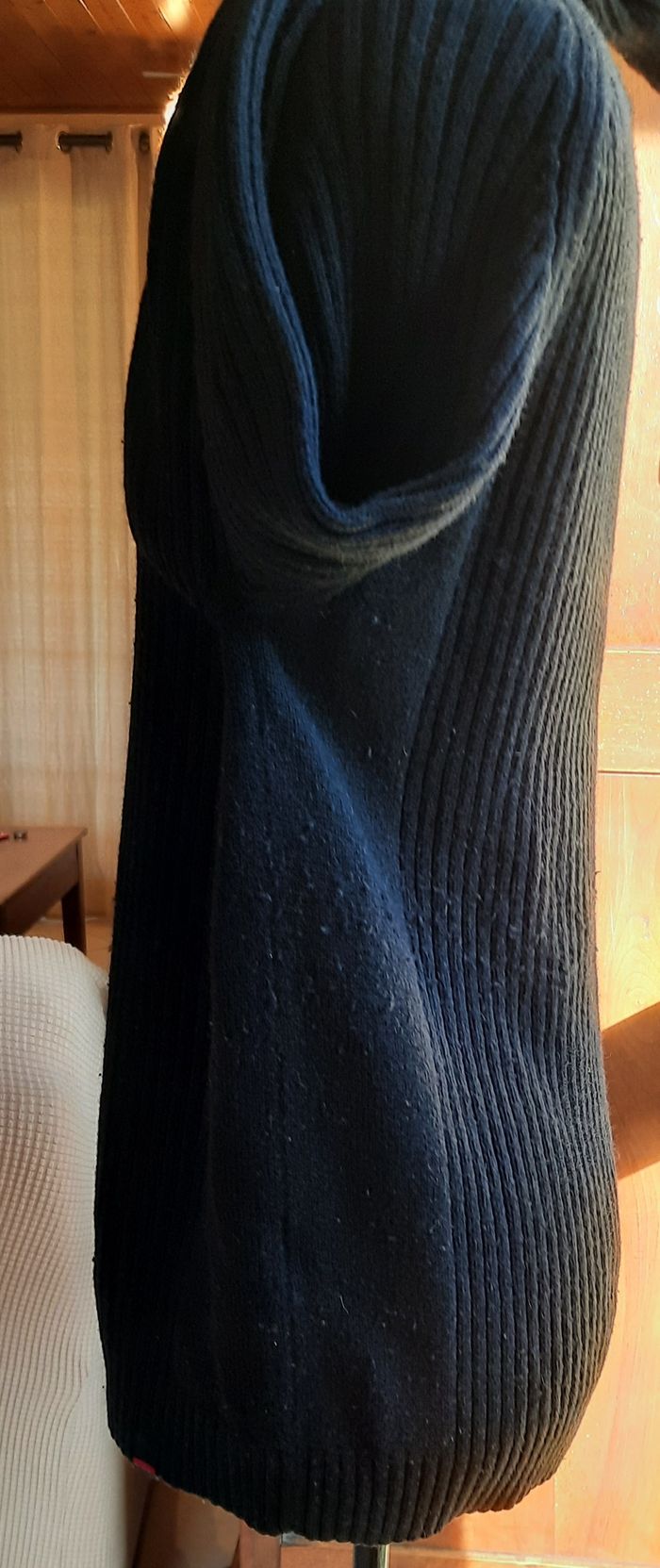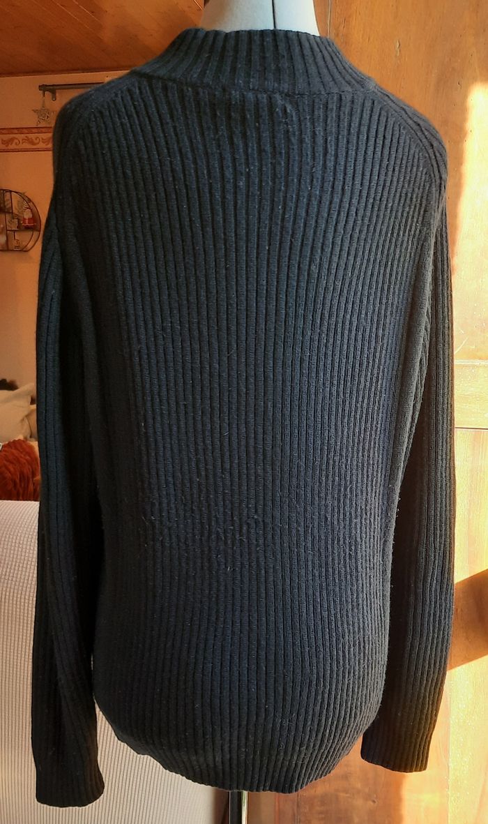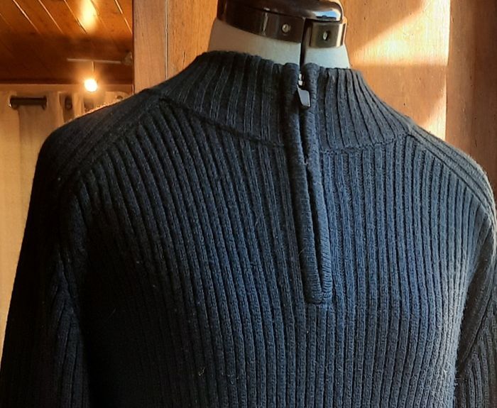 Pull noir, homme, Jules, taille L Pull à côtes épaisses, col avec fermeture zippée 48 % laine, 31 % coton et 21 % acrylique Largeur d'épaule : 44 cm Largeur sous les aisselles : 52 cm Hauteur : 70 cm Matière un peu pelucheuse