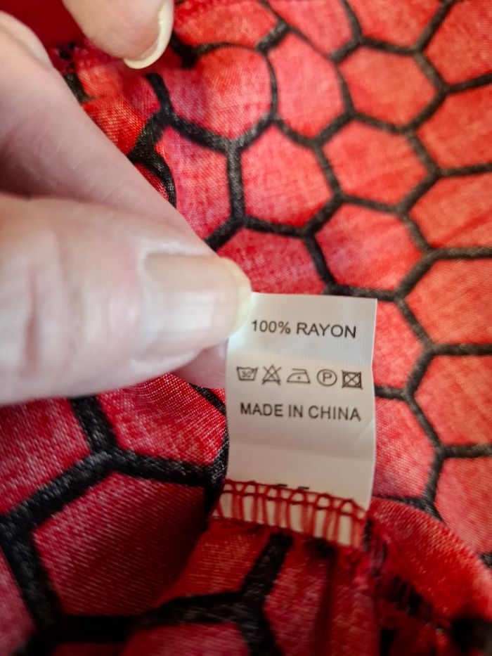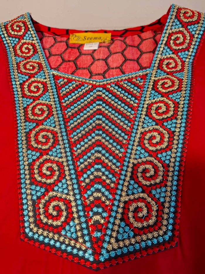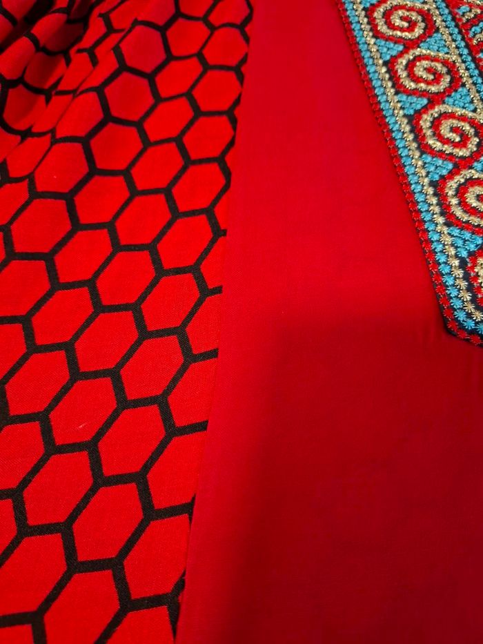 Joli robe djellaba longue pour femme, marque SEEMA, taille XXL, couleur rouge foncé, motifs noirs, magnifique "plastron" brodé poitrine, tons bleus, rouges et dorés, manches longues, en 100 % rayon (viscose ressemblant à de la soie), lavable en machine à 30° et totalement neuve, jamais portée.