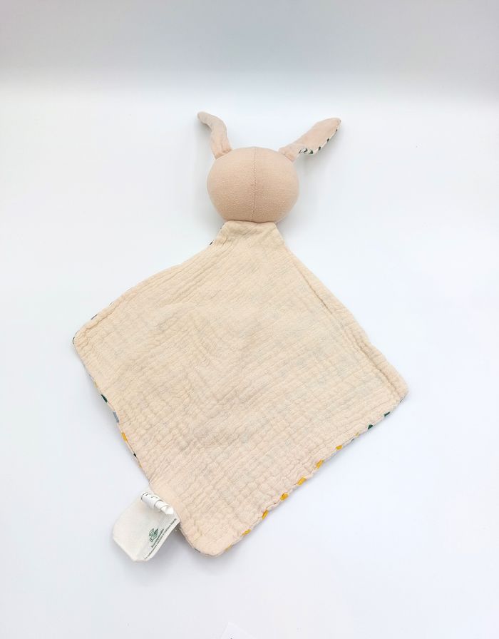Doudou plat lapin tissu beige Bébé KLORANE gaze de coton lange fleurs jaune vert - photo numéro 2