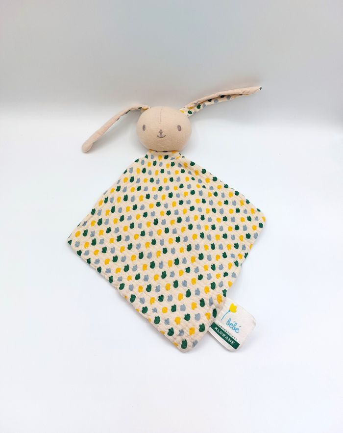 Doudou plat lapin tissu beige Bébé KLORANE gaze de coton lange fleurs jaune vert