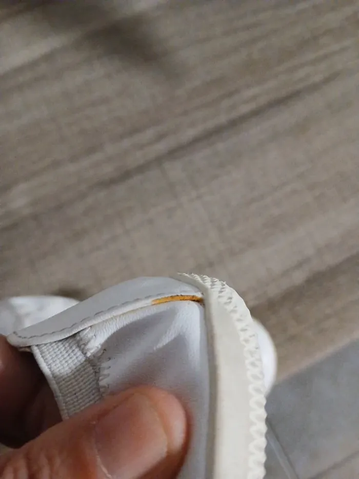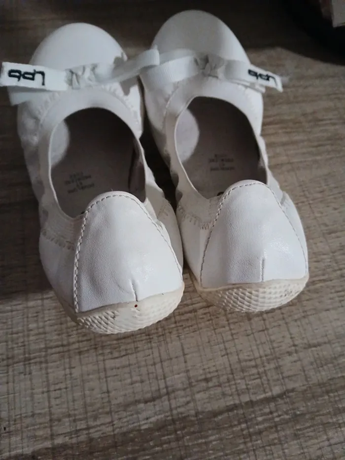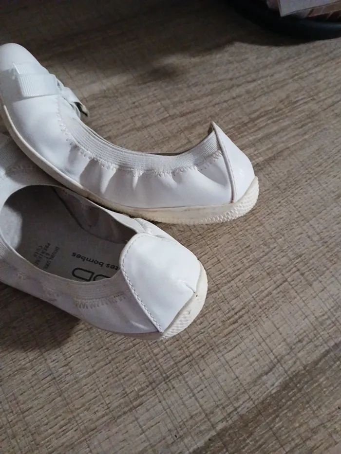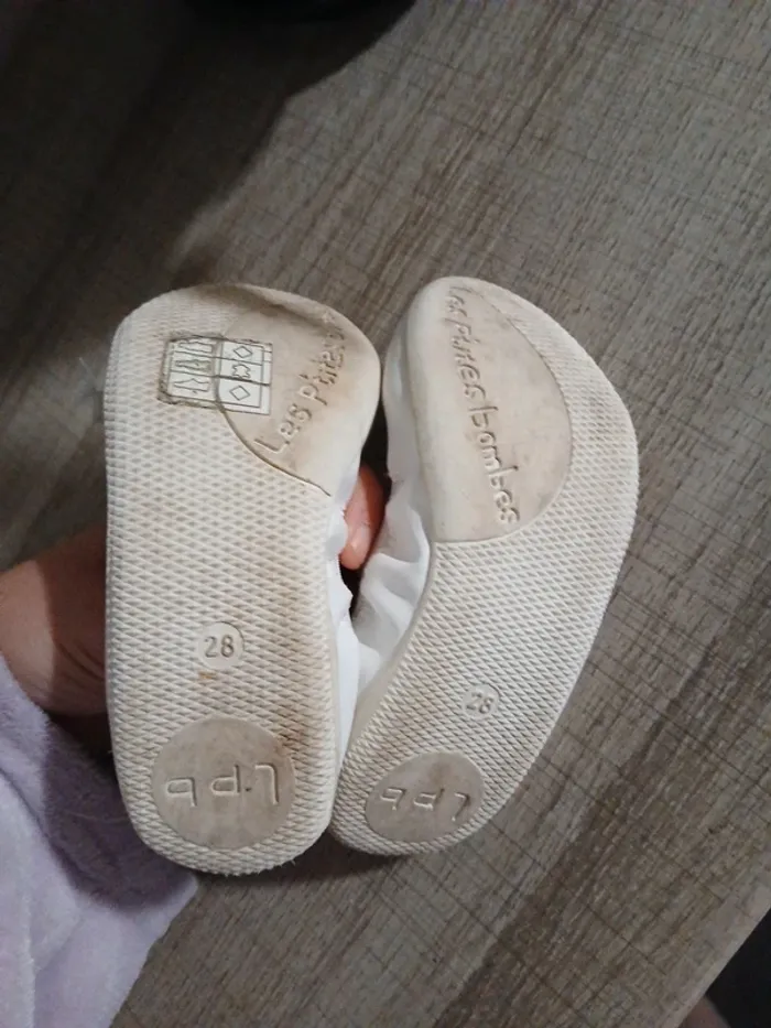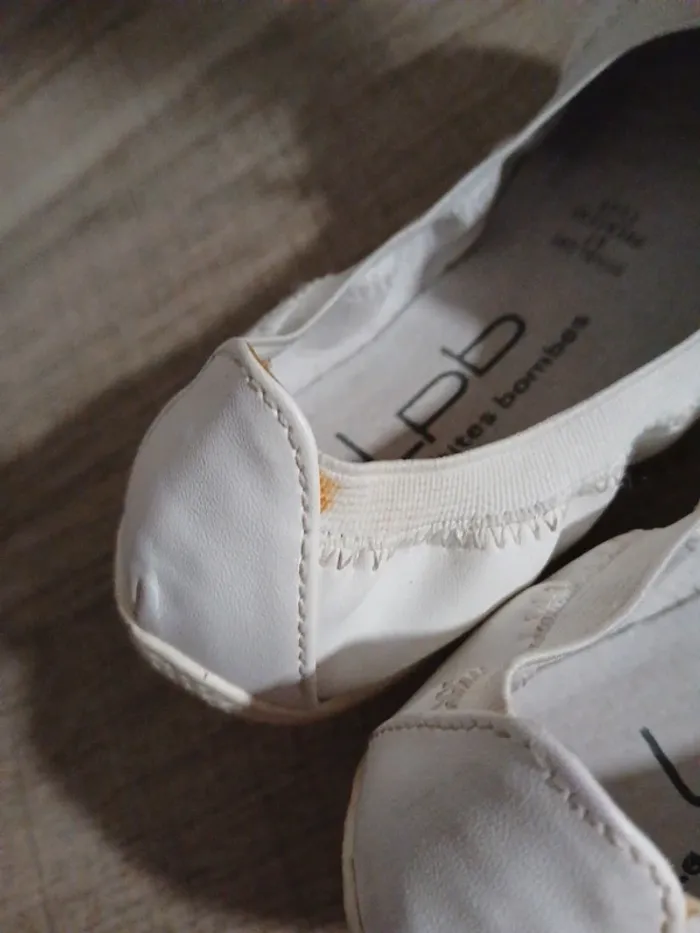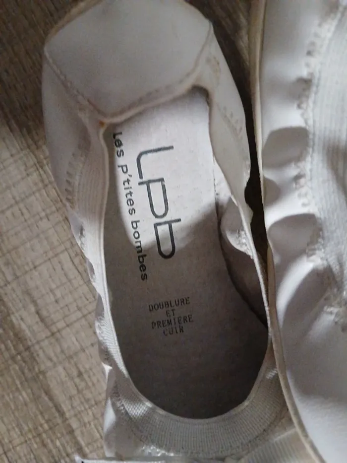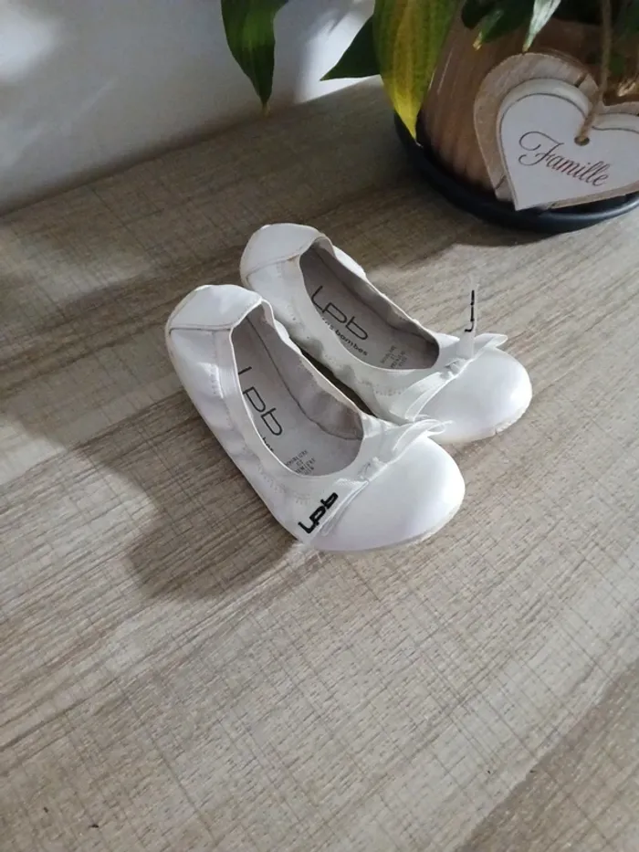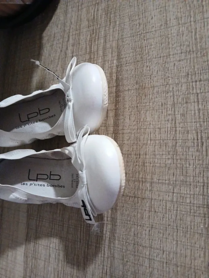 Vends une jolie paire de ballerines de la marque Les P'tites Bombes (LPB), en taille 28. Couleur : Blanc. Détails : Petit nœud décoratif sur le devant et logo "LPB" argenté sur le côté. Confort : Bordure élastiquée pour un meilleur maintien du pied. État : Les chaussures sont en bon état général mais présentent de légères imperfections (petites traces d'usage normales pour une paire blanche, voir photos). Elles restent parfaites pour une occasion ou pour l'école !