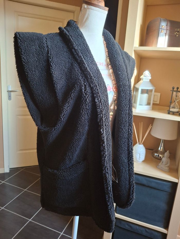 Jolie veste sans manche noire en fausse fourrure, moumoute mouton bouclette teddy ( je ne sais pas trop comment décrire la matière 🤣), neuve encore étiquetée, taille unique elle convient à toutes morphologies car ne se ferme pas. Très agréable a porter quand il fait froid.