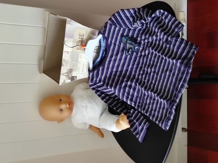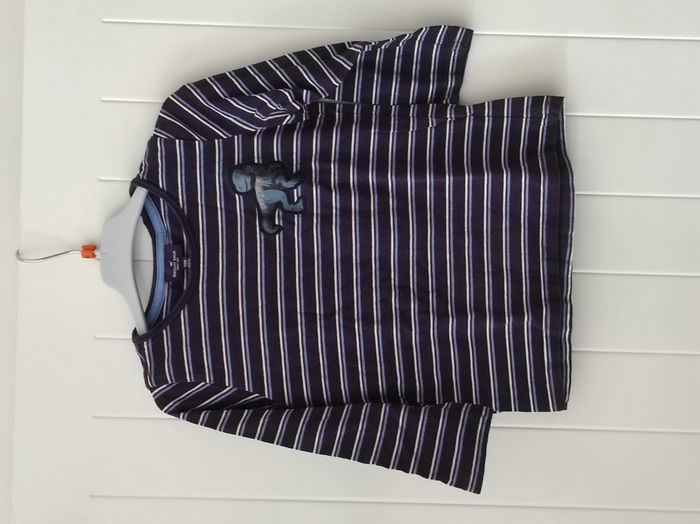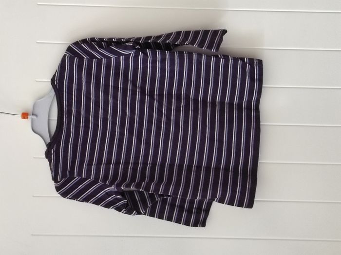 "T-shirt manches longues pour garçon, étiqueté 4 ans mais taille plutôt petit, correspond à un 3 ans. Motif rayures et dinosaures, coloris violet, bleu et blanc 🦖 Tissu confortable, idéal pour le quotidien ou l’école. ➡️ Très bon état"