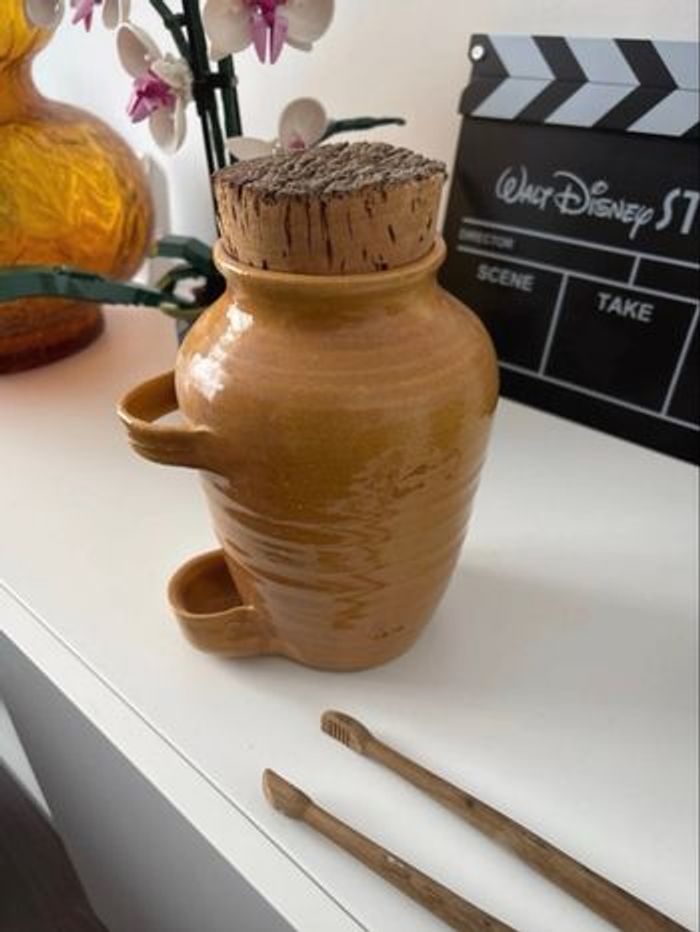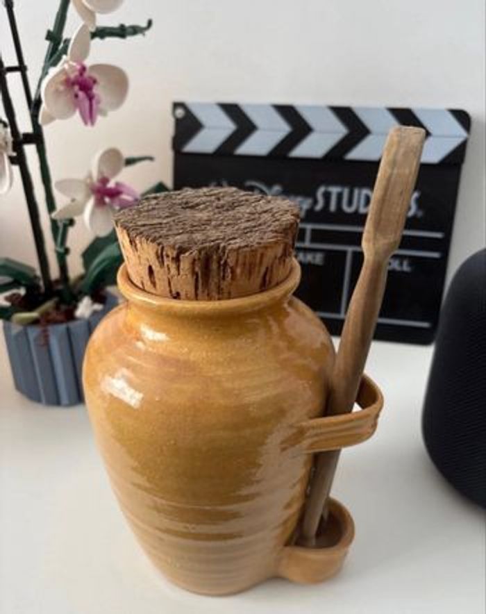 Pot à cornichons ocre en grès ancien - signé Massot 1981 - avec pince en bois - très bon état