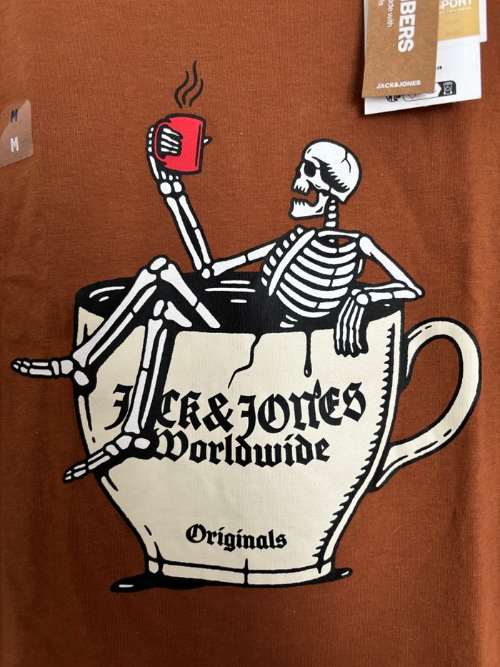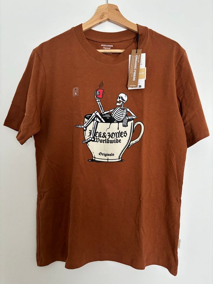 T-shirt neuf avec étiquette Jack&Jones flocage squelette dans une tasse « Worlwide - Originals » Camel Manches courtes Taille M