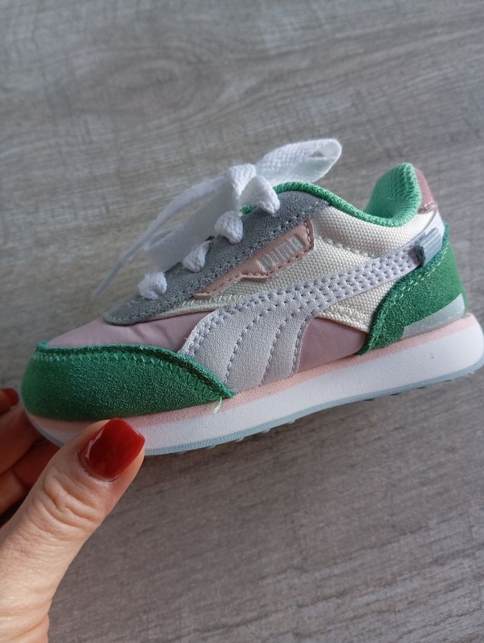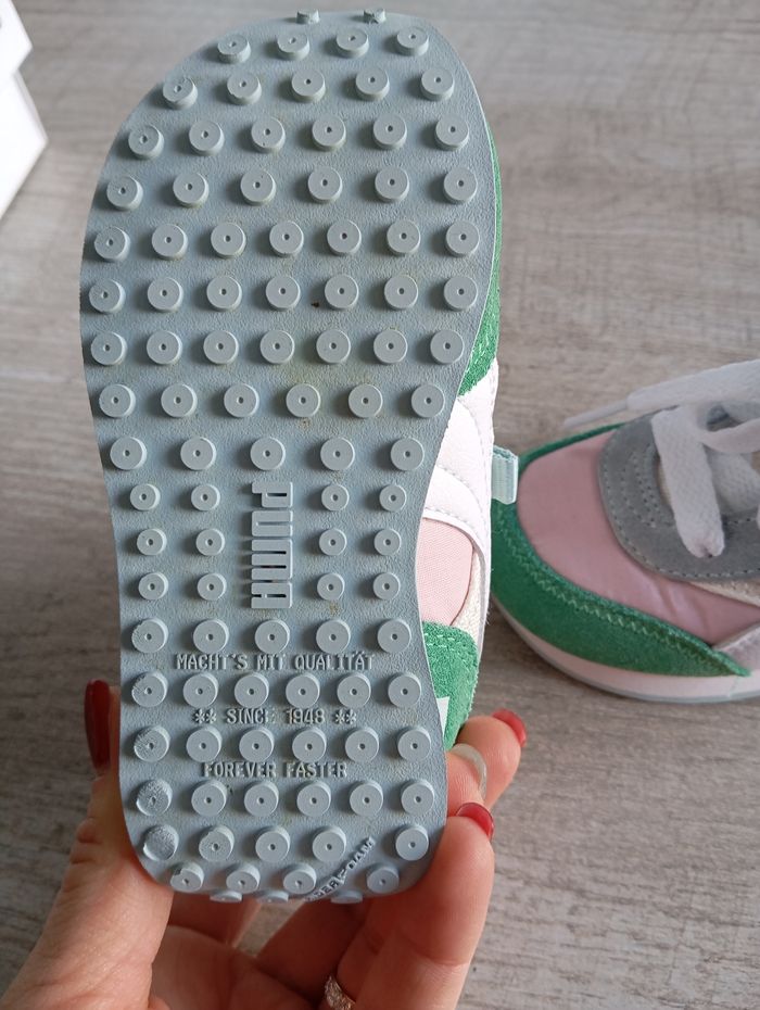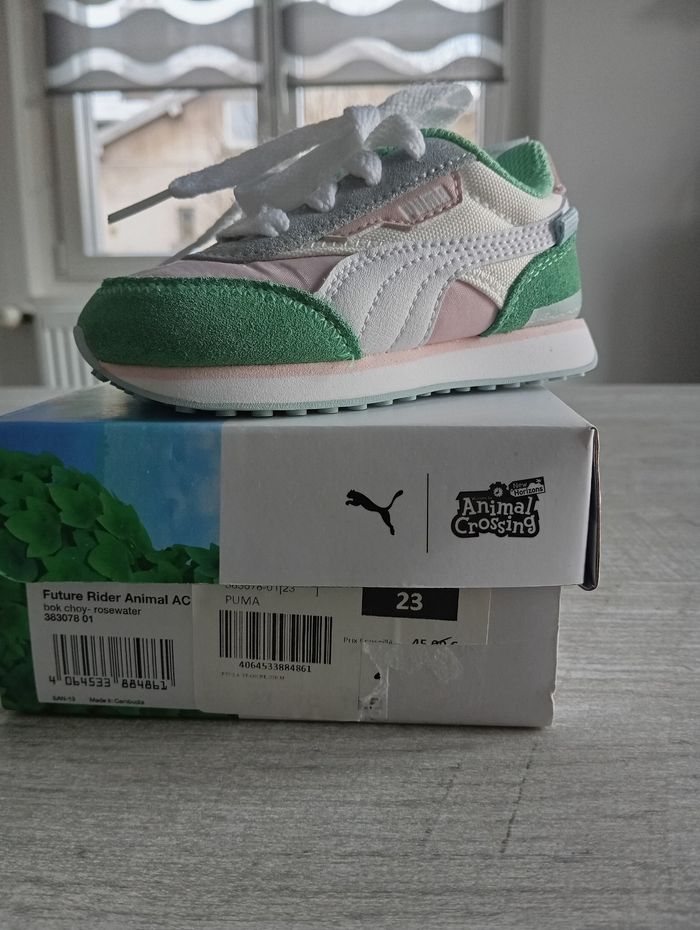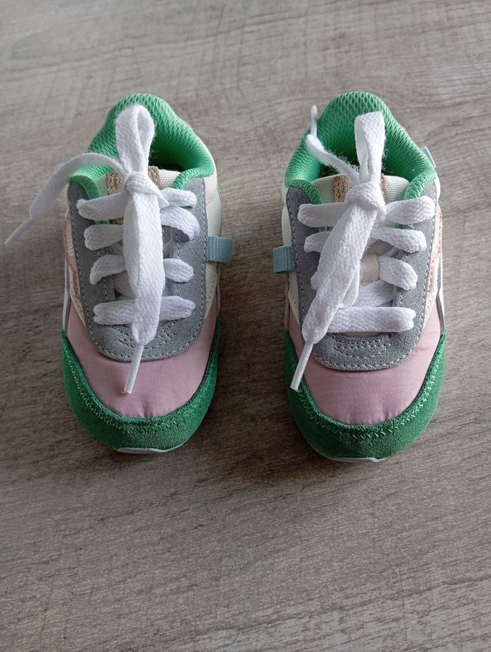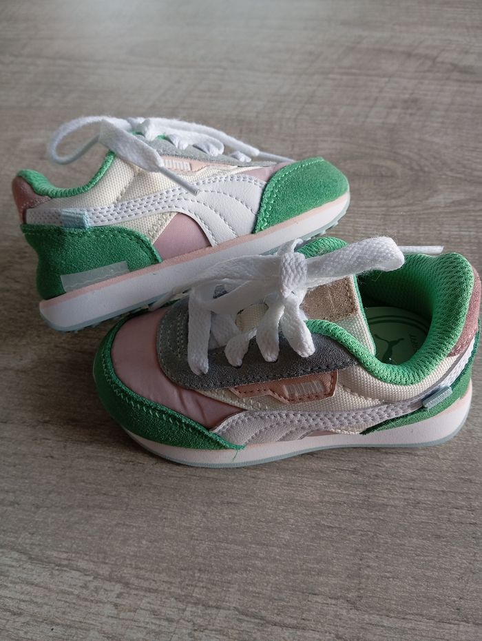 Vends basket Puma taille 23 portées deux fois. Nous avons ôté les lacets élastiques afin de pouvoir ouvrir entièrement la basket pour y glisser le pied de notre enfant. C'est la seule modification que nous avons fait à la chaussure afin d'être plus pratique. Elles n'ont aucun accrocs.