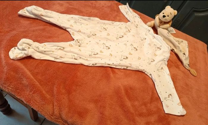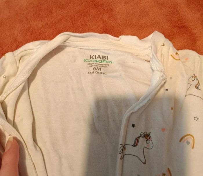 joli pyjama une pièce (dors-bien) pour bébé fille de la marque Kiabi (gamme Eco Conception). Motifs : Imprimés licornes, arcs-en-ciel et petites étoiles sur fond blanc. Matière : 100% coton biologique, doux et respectueux de la peau de bébé. Taille : 6 mois (63-69 cm / jusqu'à 8kg). Praticité : Fermeture zippée sur toute la longueur pour faciliter le change. Pieds intégrés pour garder les pieds au chaud. État : Très bon état.