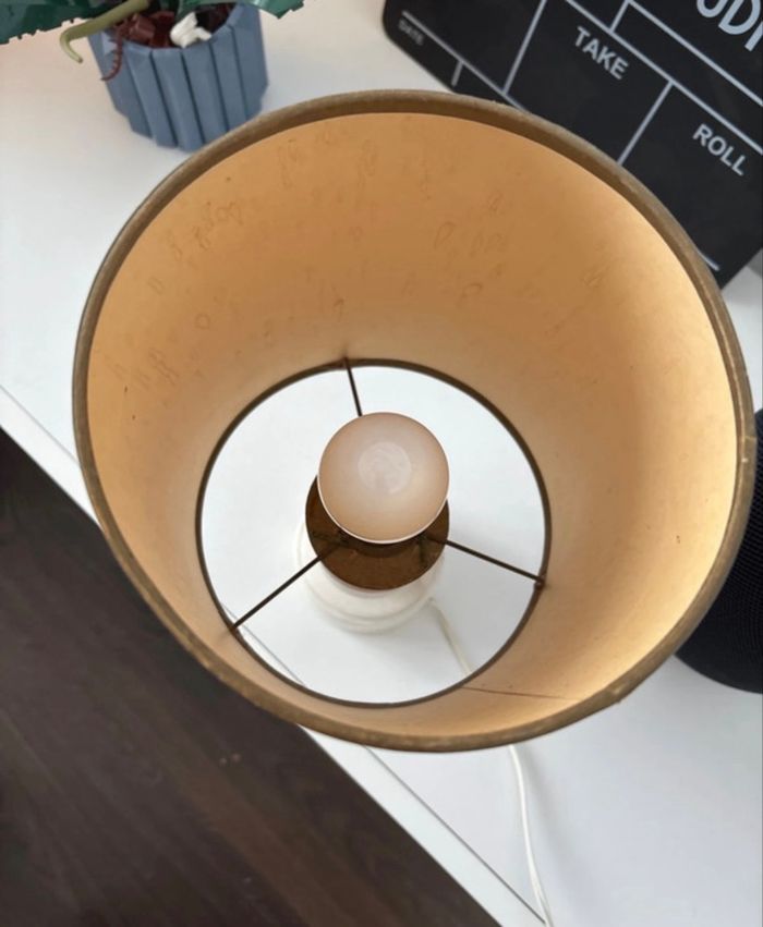 Lampe à poser vintage - année 70 - pied en marbre - bon état L’abat jour présente des taches - voir photo Pour ampoules à bâillonnâtes - non vendu avec Dimensions : Hauteur : 29 cm Diamètre abat jour : 16 cm