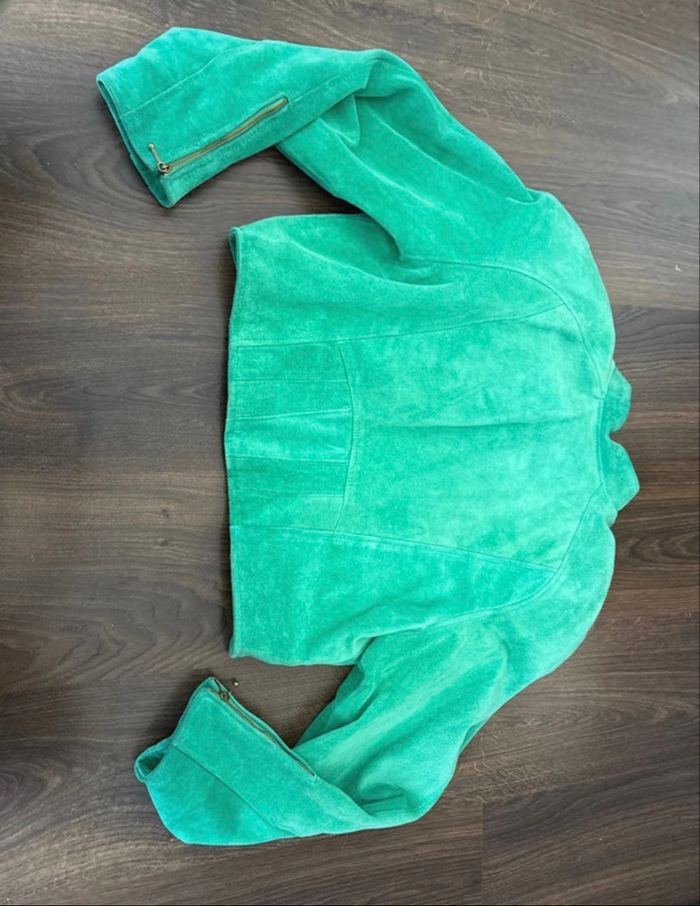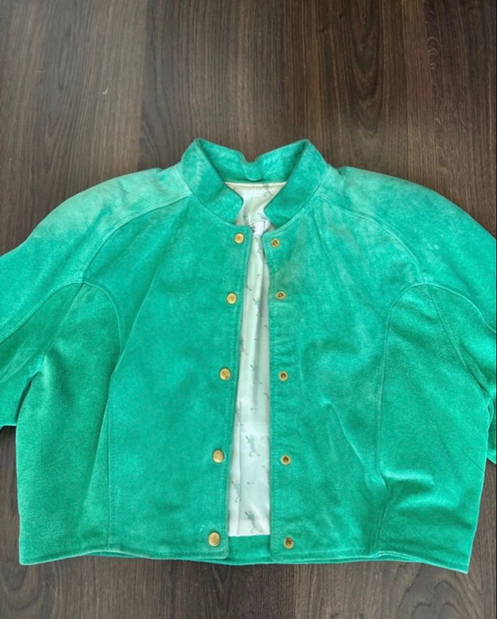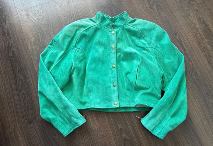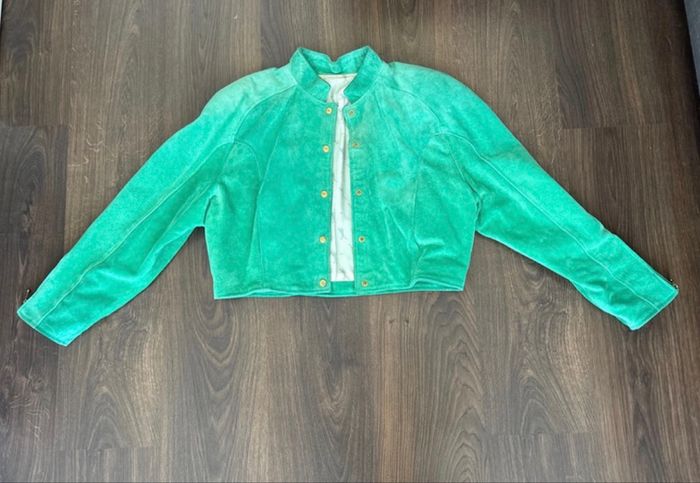 Veste courte en cuir vert vintage avec épaulettes année 80 Rock Line - très bon état - photo numéro 1
