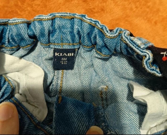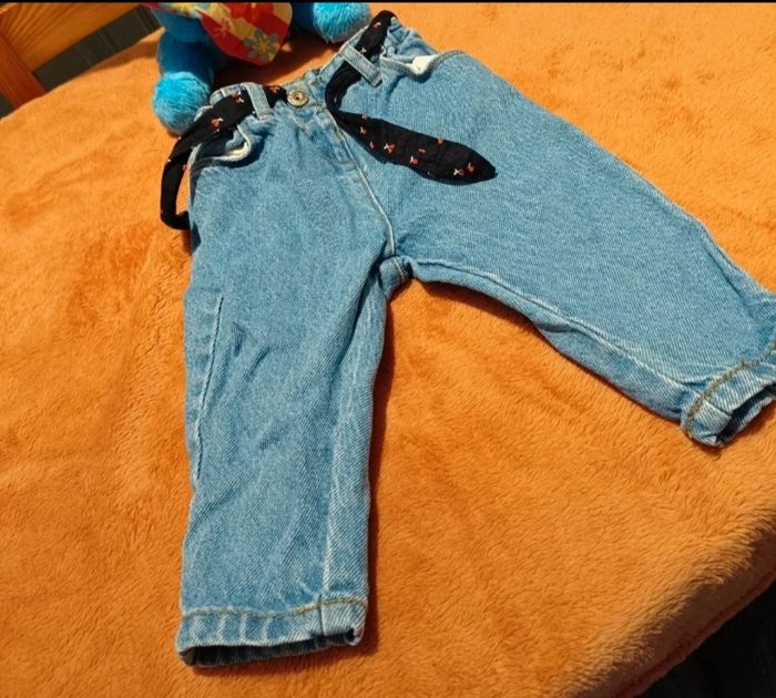 joli jean pour bébé de la marque Kiabi. Coupe : Coupe confortable avec taille élastiquée pour un habillage facile. Détail : Vendu avec sa petite ceinture en tissu noir à motifs cerises/fleurs rouges. Taille : 6 mois (68 cm). Praticité : Deux petites poches à l'arrière. État : Très bon état.