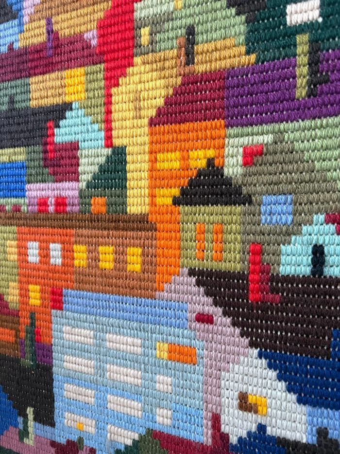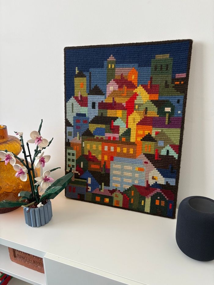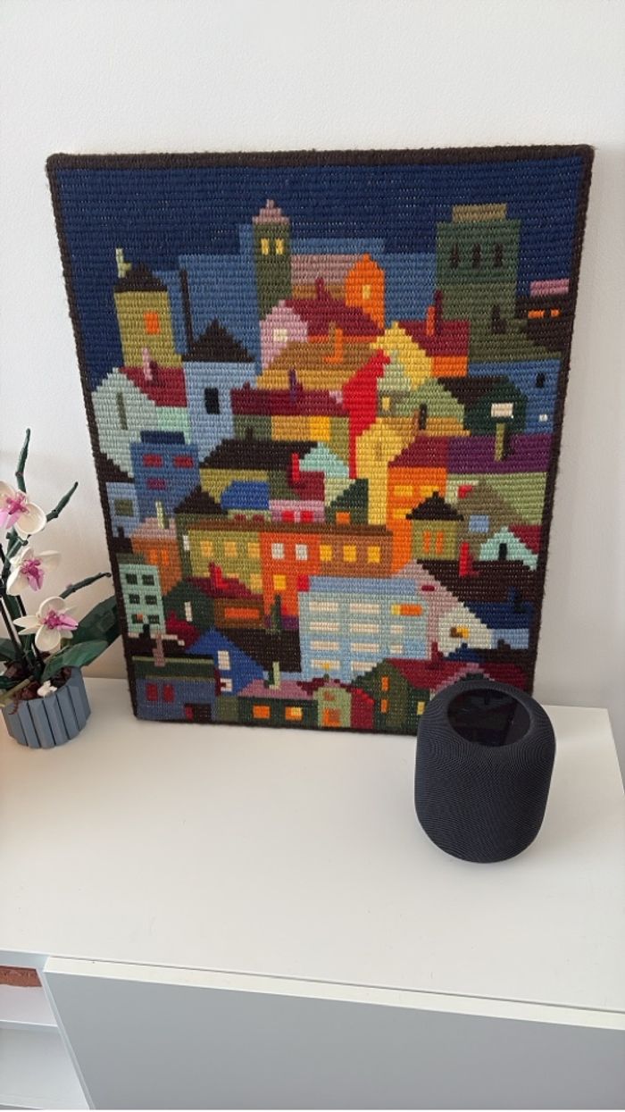 Grande tapisserie murale en laine couleur pop - année 70 - très bon état sur cadre type canevas Dimensions : Hauteur : 67 cm Largeur : 50 cm Épaisseur : 4,7 cm