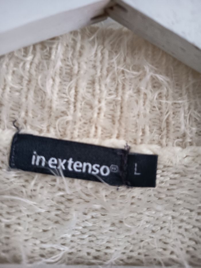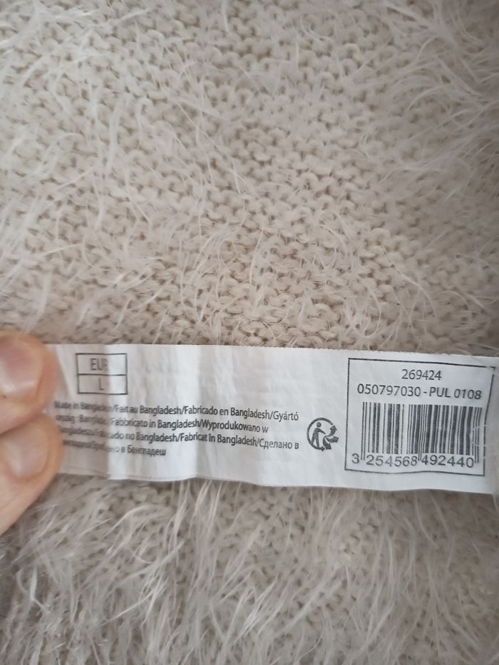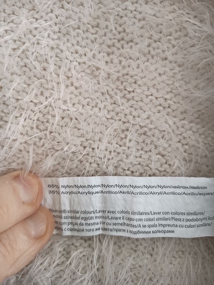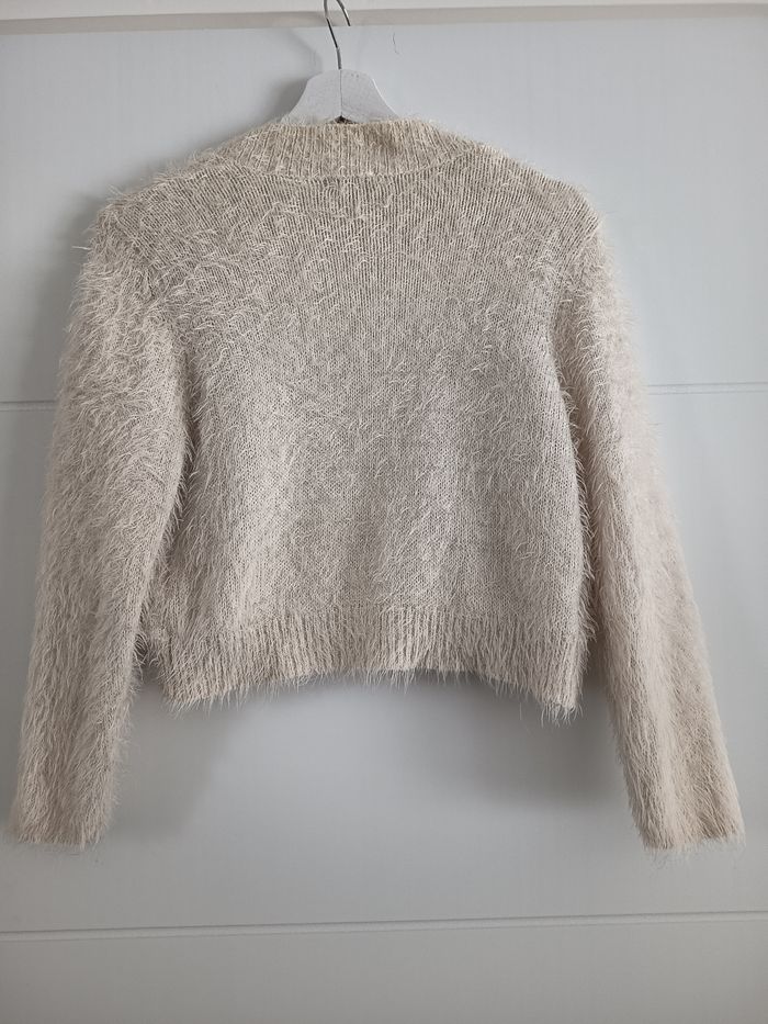 Idéal sur une jolie robe pour profiter des soirées fraîches... Petit gilet beige, sans bouton, aux bords arrondis. Taillé L. Prix: 3€