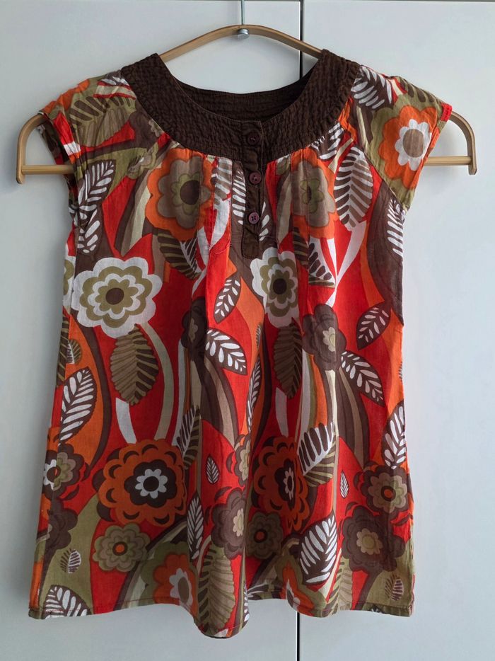 Blouse de marque Pick Ouic, manches courtes, taille 5 ans, 100% coton. Motifs dans les tons orange / marron / blanc, 3 boutons sous col.