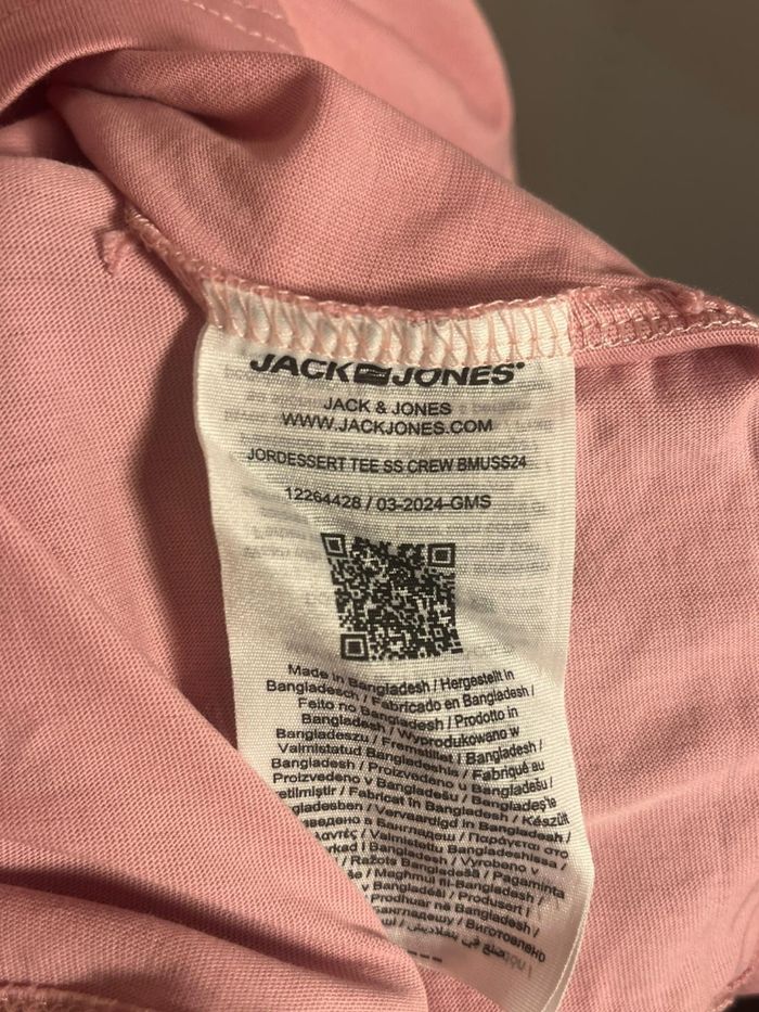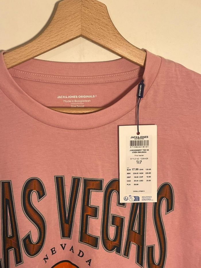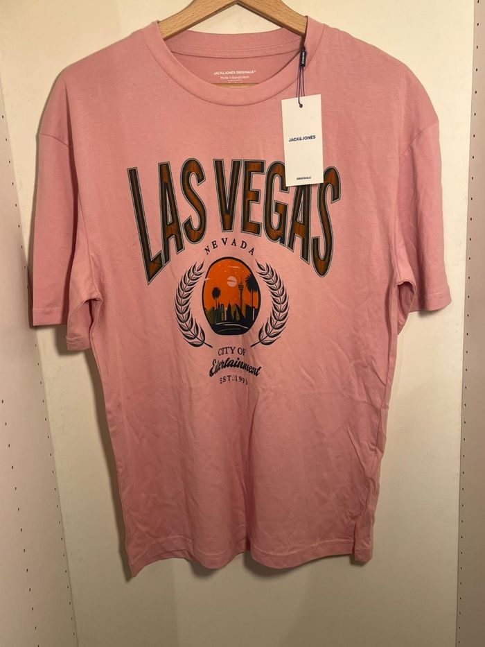 T-shirt rose en coton de la marque JACK & JONES, collection Originals. Modèle “Las Vegas – City of Entertainment” avec imprimé graphique : palmiers, buildings, coucher de soleil et lettrage stylisé. Texte visible : LAS VEGAS – NEVADA – City of Entertainment Taille : S (voir étiquette) État : neuf, jamais porté Fabrication : Bangladesh Logo et design parfaitement nets, idéal pour un look streetwear ou casual. Authenticité garantie – étiquette de col