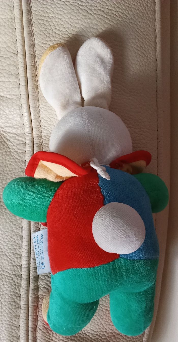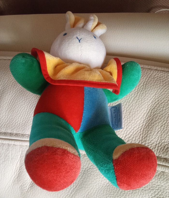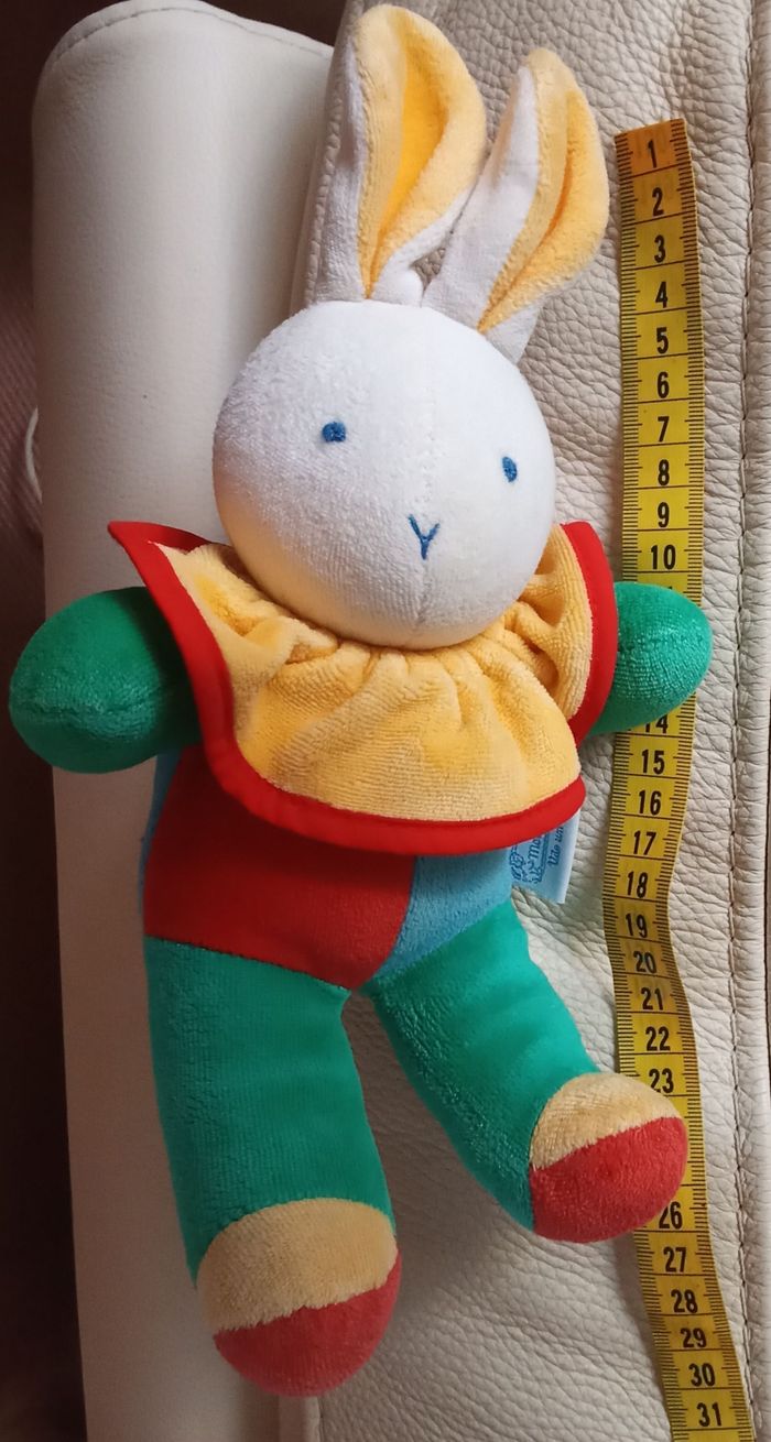 Doudou peluche lapin lapine tête blanche et corps multicolore Col / collerette jaune avec contour rouge Bras verts / vert Tête blanche Yeux et bouche sont brodés Date fin des années 90 eighties Dessous des pieds sont rouges Il est d'occasion en bon état , usure légère possible d'utilisation Au niveau des oreilles ,.il y a un petit peu de décoloration sur la partie blanche
