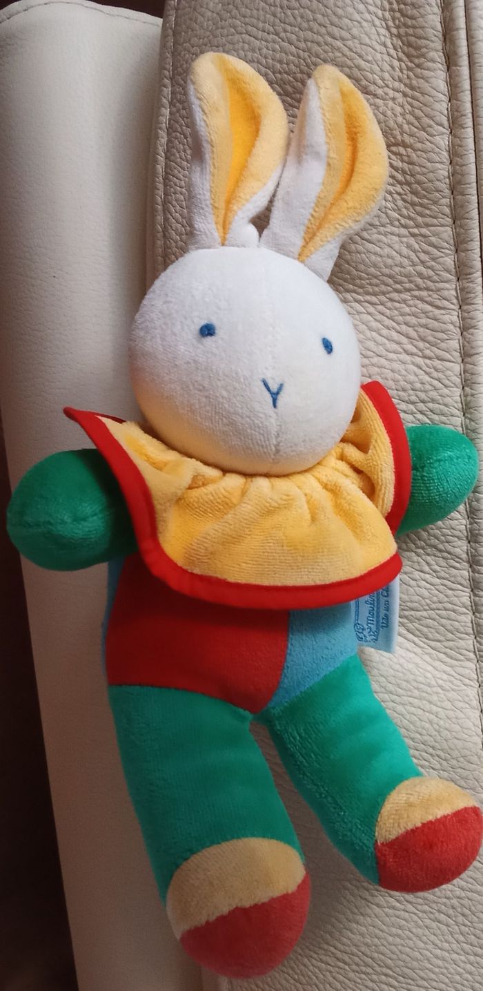 Doudou peluche lapin Moulin Roty vite un câlin multicolore d'occasion blanc vert bleu rouge - photo numéro 1