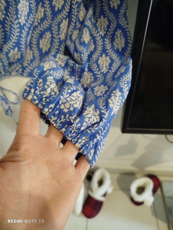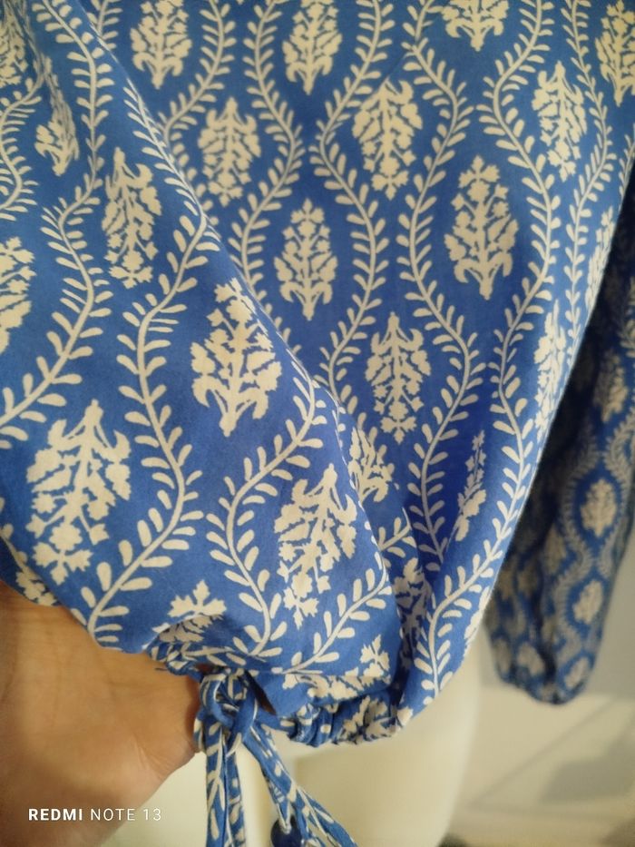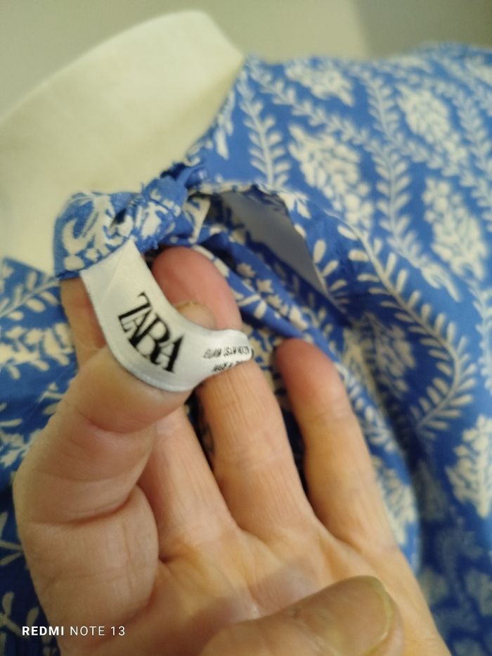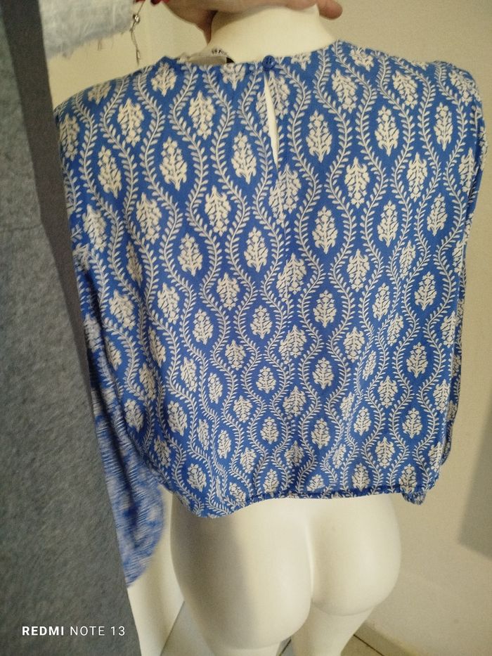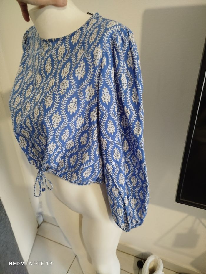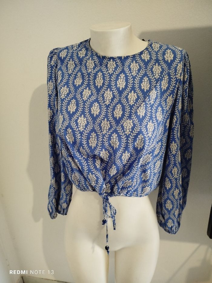 #kytieMfemme. Top blouse taille M de marque Zara léger cordon a la taille court bleu et blanc se ferme dans le dos par un bouton les poignées sont élastiques mesure des épaules 38 cm des aisselles 48 cm hauteur 50 cm en excellente état 100 % coton ref 685