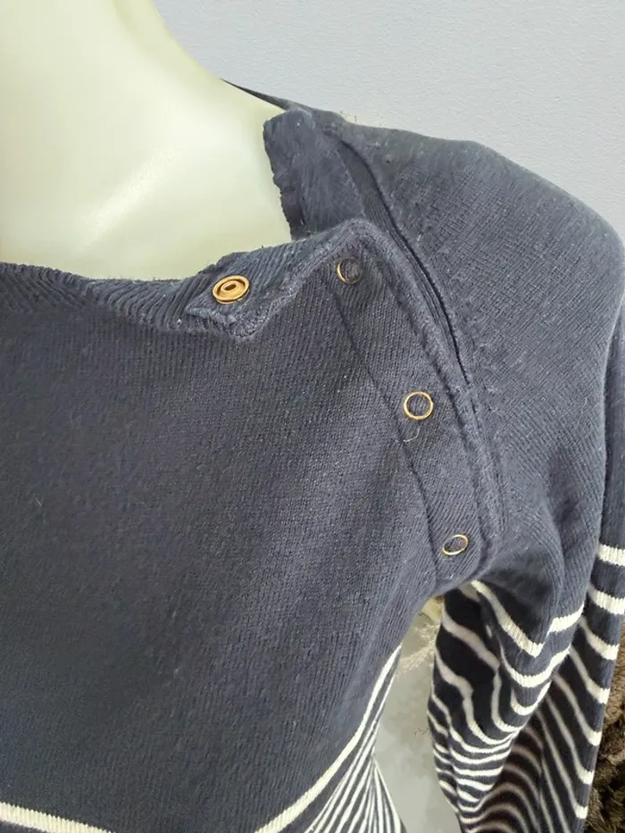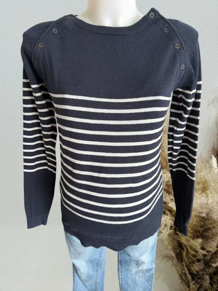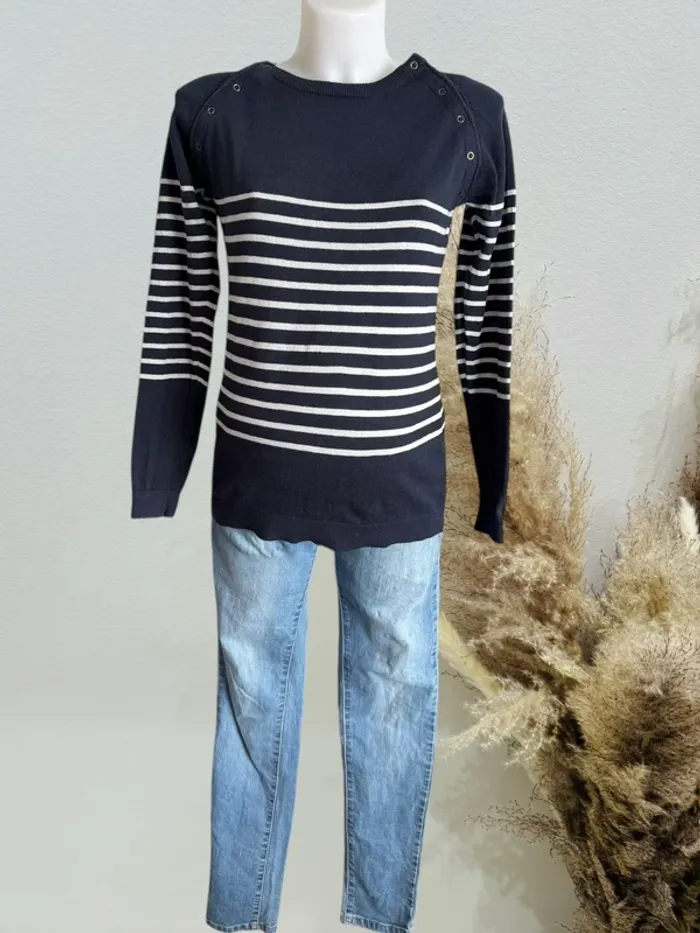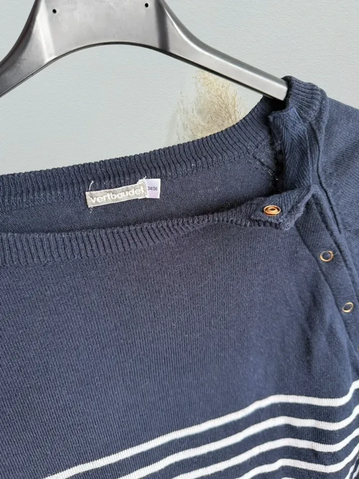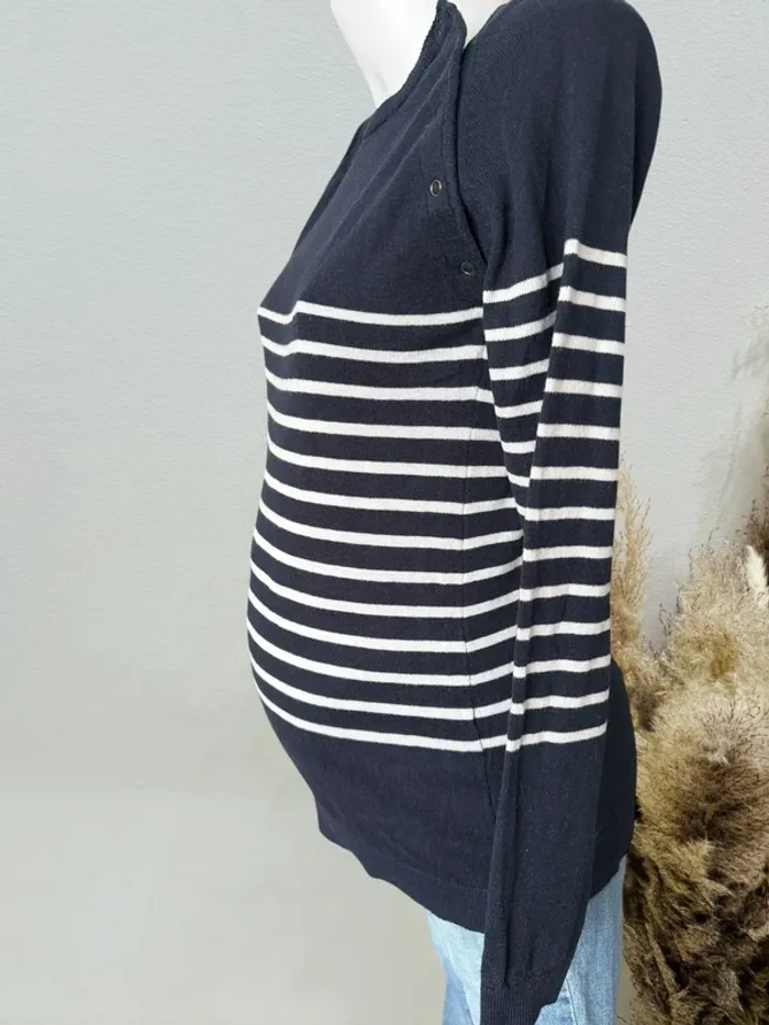 Pull de grossesse et d’allaitement Taille 34/36 XS/S Marque: vertbaudet Couleur: marinière marine blanc Pression des 2 côtés (1 à changer ou conserver en l’état/ cf photos)