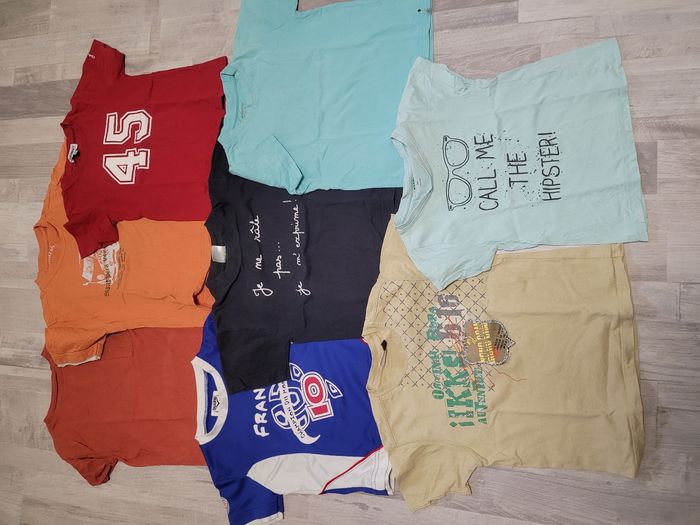 Il comprend : - 7 polos idéal pour enfant qui aime jouer dehors ils sont tâcher et décolorés pour certains -22 Tee-shirts idéal pour enfant qui aime jouer dehors ils sont tâcher et décolorés pour certains - 5 gilets idéal pour enfant qui aime jouer dehors ils sont tâcher et décolorés surtout le gris - 1 short neuf - 2 pulls bon état - 1 veste coupe vent très bon état juste une petite tâche