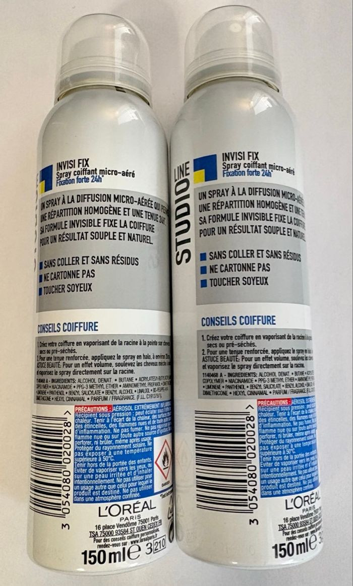 Vends lot de 2 bouteilles de spray coiffant L'Oréal Paris Studio Line - Invisi Fix (Fixation Forte n°6). • Format : 150ml par flacon. • État : Neufs, jamais utilisés (avec capuchons). • Points forts : * Diffusion micro-aérée pour un résultat ultra naturel. • Tenue 24h sans cartonner et sans résidus. • Toucher soyeux. Idéal pour fixer une coiffure tout en gardant de la souplesse. Envoi rapide et soigné. 📦