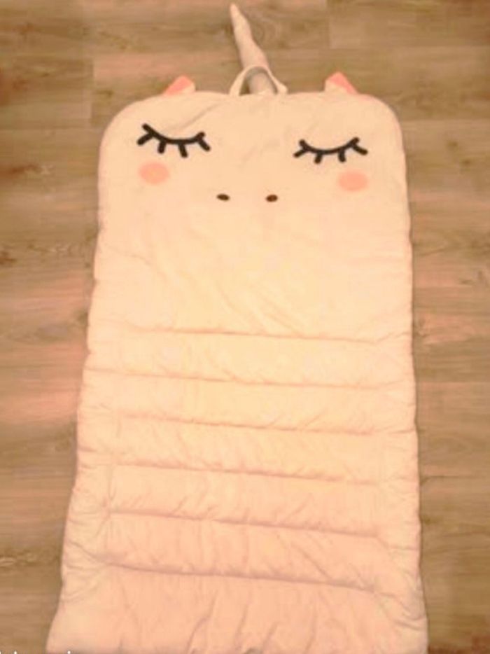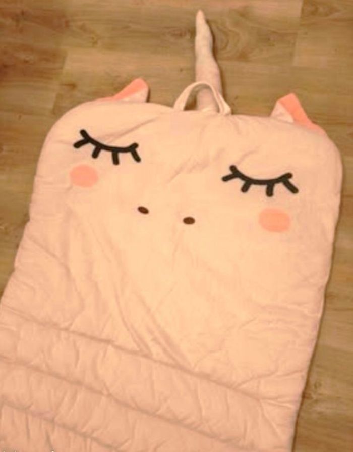 Tapis de sieste licorne blanc et rose. Corne de licorne au bout du tapis. Possibilité de l'enrouler pour le transporter. DIMENSIONS : 65 x 106x 3 cm. ( Sans la corne)