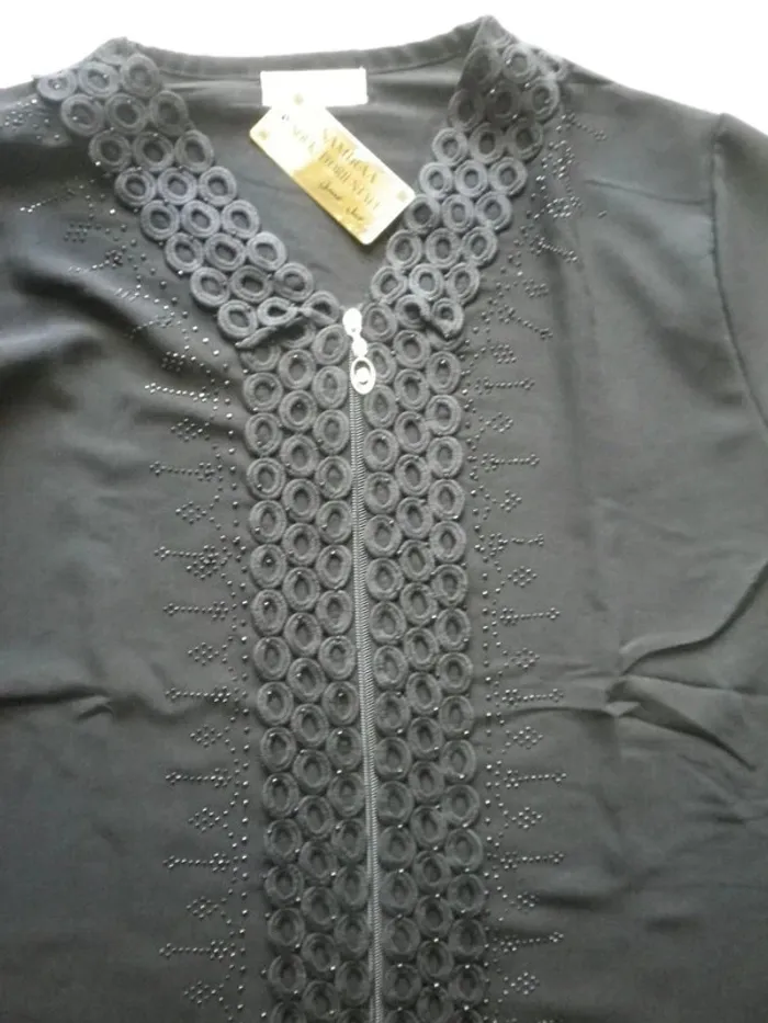 DE COULEUR NOIR. SUPERBE TISSU FLUIDE ET RETOMBANT ( ne se froisse pas). REHAUSSER TOUT LE LONG DE LA ZIPP. NEUVE ENCORE ETIQUETTEE. CADEAU QUE L ON M A FAIT EN PROVENANCE DE DOUBAÏ MAIS CE N EST PAS MON STYLE. TAILLE NOTEE : L ET PEUT AUSSI ALLER A UN PETIT 42, PORTE DIFFEREMENT. Largeur aisselle, devant fermée : env 57cm Longueur totale : env 140cm.