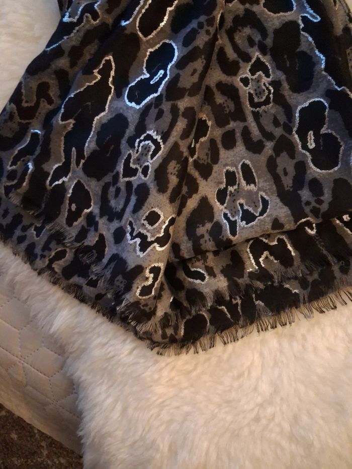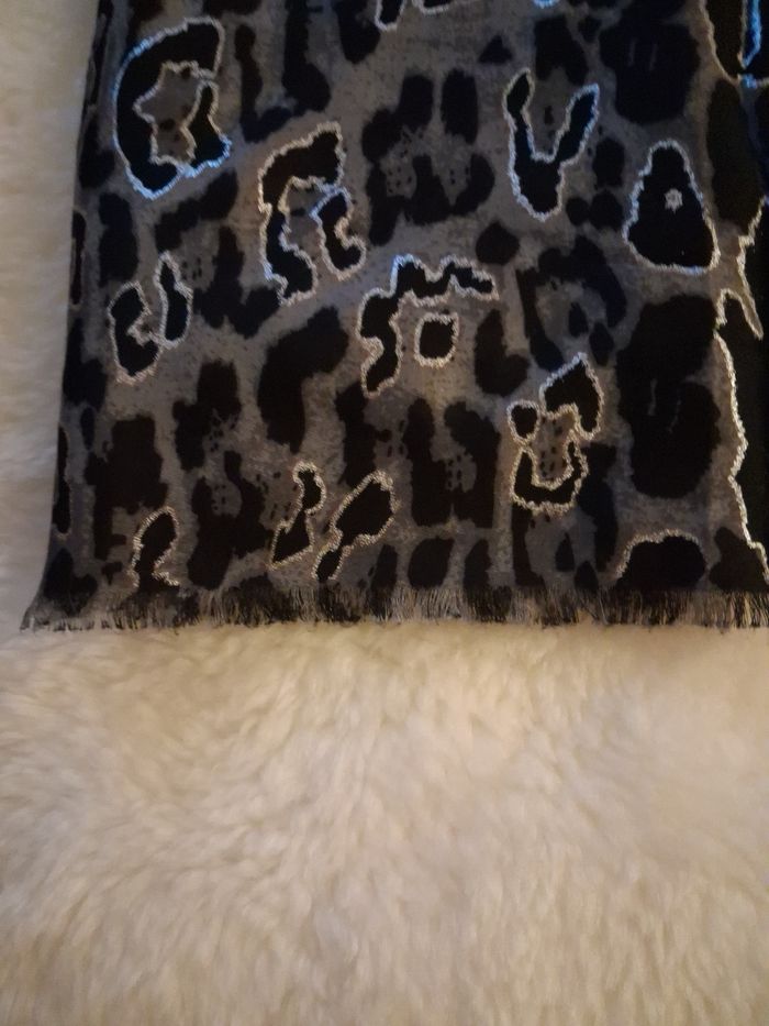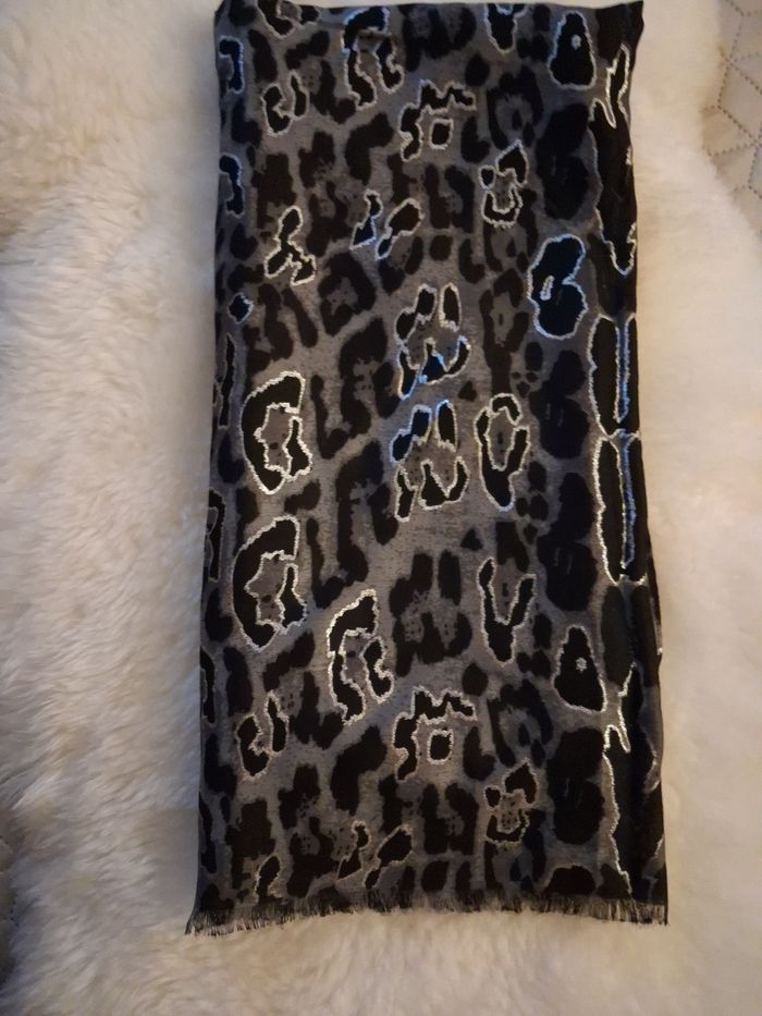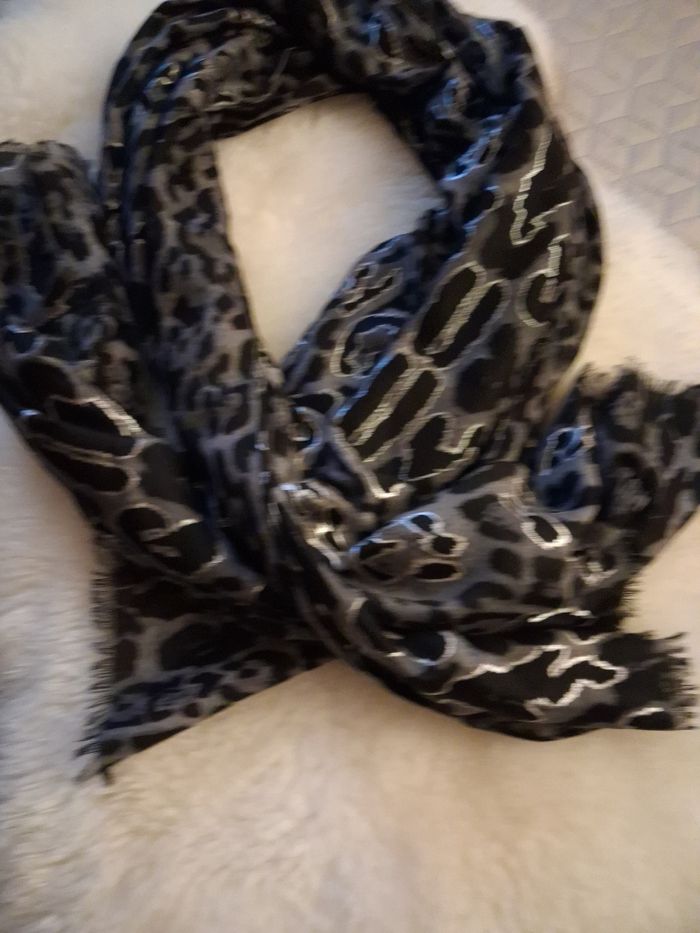 Écharpe neuve sans etiquette. Couleurs :noir, gris et argenté. Matière 100%polyester. Longueur total 1m80 ,largeur 90cm. Envoi rapide et soigné.