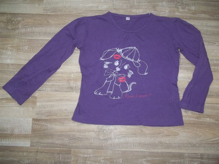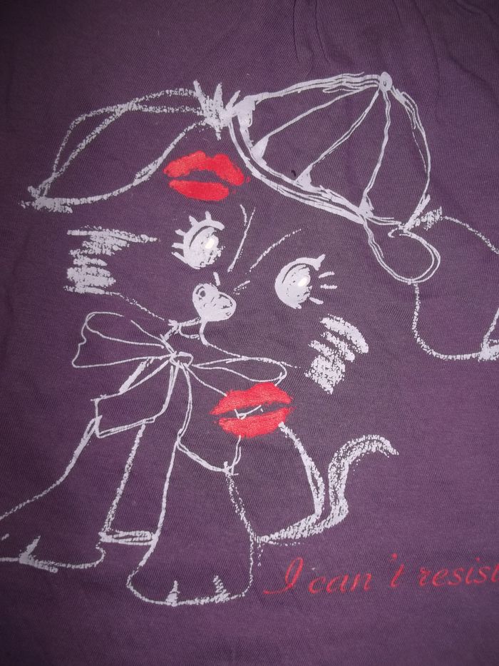 Tee-shirt à manches longues et col rond ample, 100 % coton violet, petites fronces au col et épaules. Sérigraphie mauve petit chien à casquette "I can't resist". Large mais plutôt court pour du 10 ans. Longueur 41 cm, manches 39 cm, largeur épaules 33 cm, aisselles 37 cm, poignets 9/10 cm.