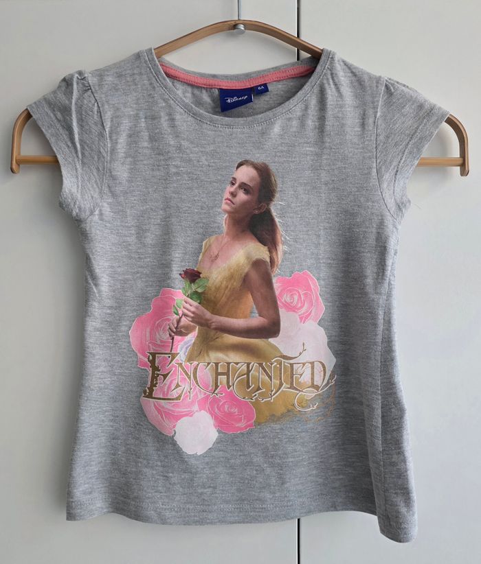 T-shirt de marque Disney, manches courtes, taille 6 ans, 91% coton, 9% polyester. Couleur gris, motif la belle et la bête.