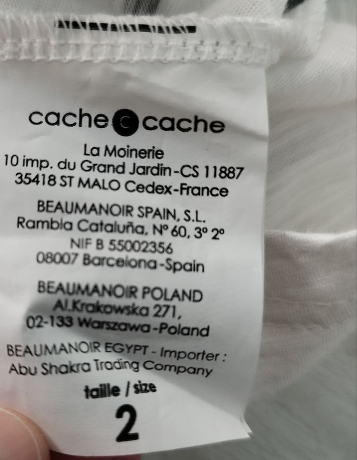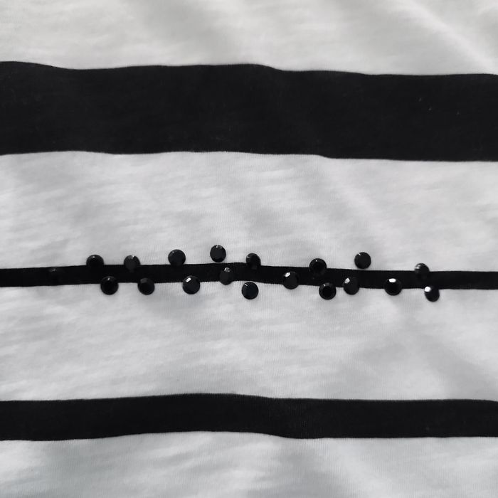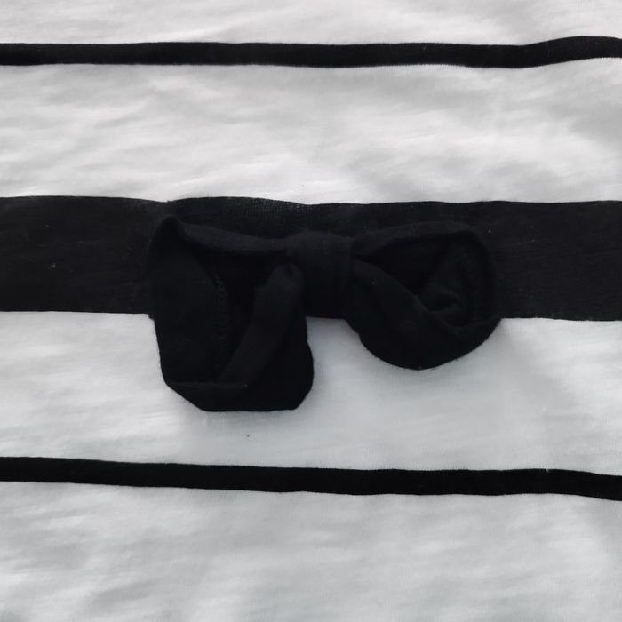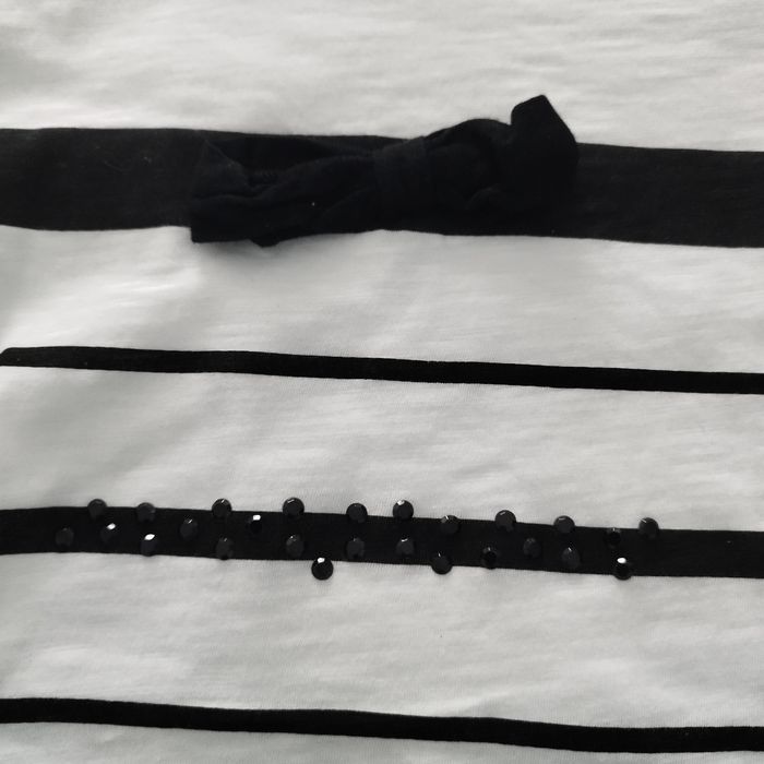 Blanc à motifs noirs, 2 noeuds noirs cousus, strass noirs, jamais porté, transparent et un peu cintré, entre taille 36 et 38
