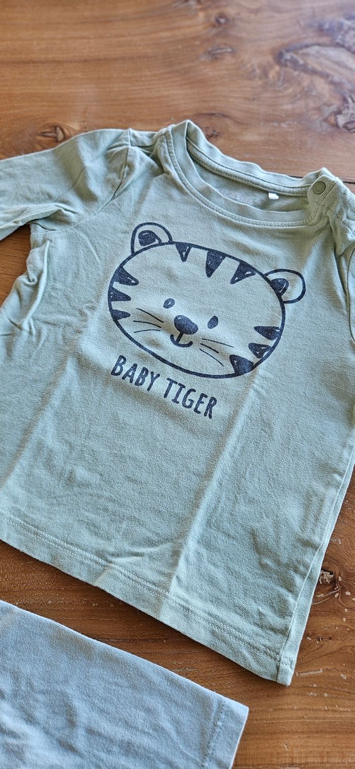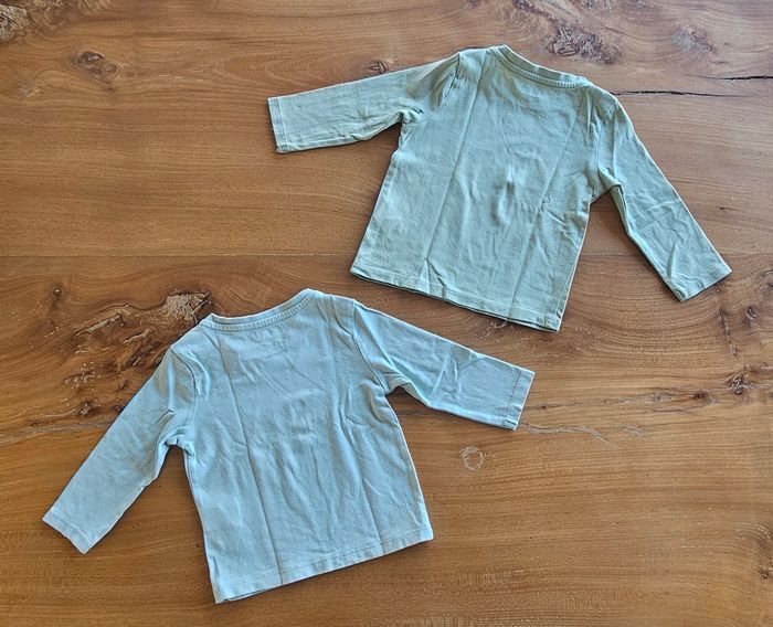 Lot de 2 tee-shirts manches longues bébé garçon : • Tee-shirt manches longues vert clair. Dessin imprimé sur le devant. Ouverture pressionnée sur l'épaule. • Tee-shirt manches longues vert foncé, dessin imprimé sur le devant. Ouverture pressionnée sur l'épaule. Portés mais reste en très bon état. Aucune tâche, ni trou 👌