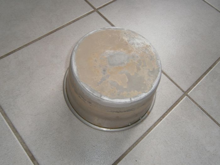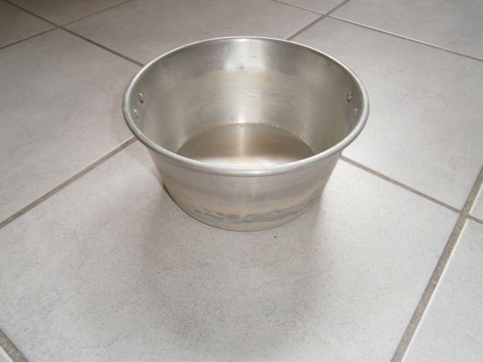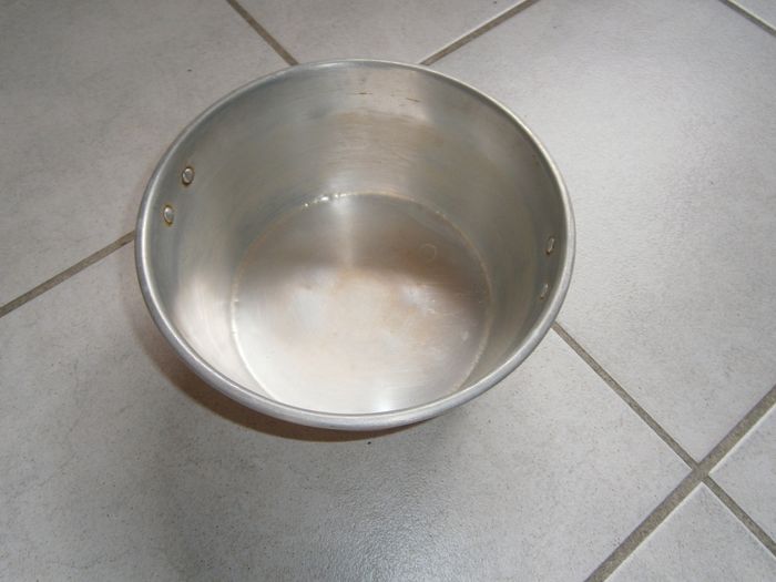 Moule pour crème renversée. En alu. Diamètre = 19 cm. Hauteur = 8,50 cm. N'a pas de anses. Les marques blanches sont du calcaire dû à la cuisson dans l'eau. Elles partent en frottant le moule sec.