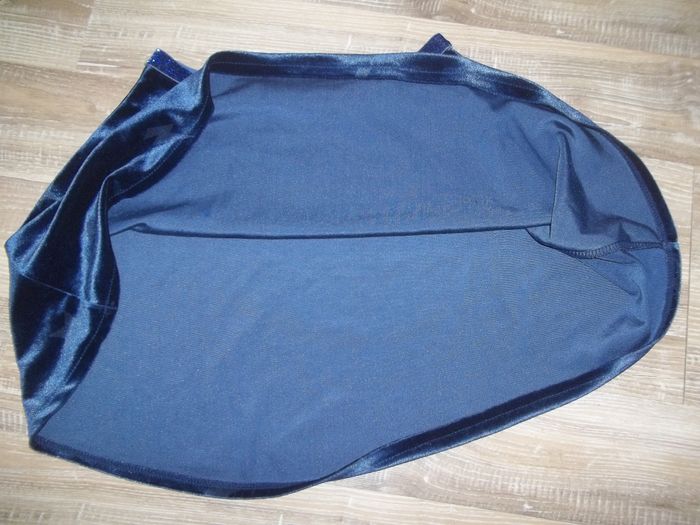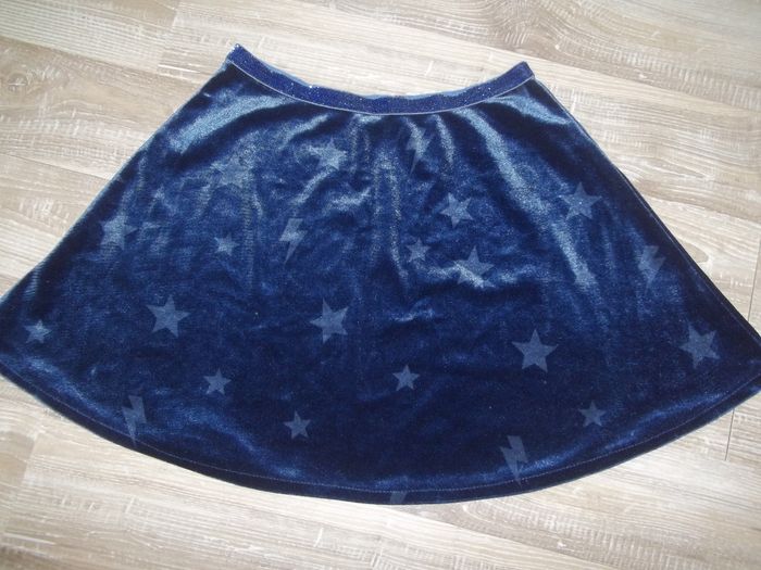 Jupe ample courte simple épaisseur en velours ras bleu foncé imprimé étoiles et éclairs effet légèrement scintillant, 92 % polyester 8 % élasthanne. Sans ouverture, taille élastique brillant. Longueur petit 33 cm, largeur min taille 27 cm.