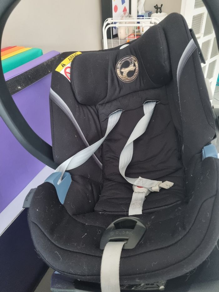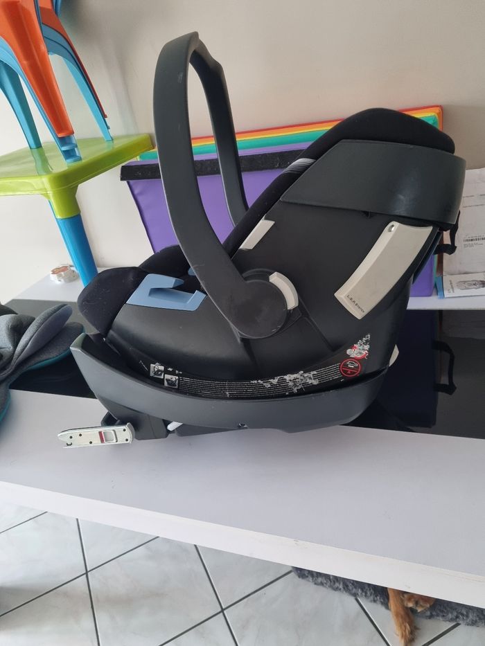 Cosy cybex aton 5. Bon état. Avec base cybex et adaptateur pour mettre le cosy sur la poussette J'ai tout les petites mousses à mettre les anses qui n'apparaisse pas sur la photo car on les a nettoyer