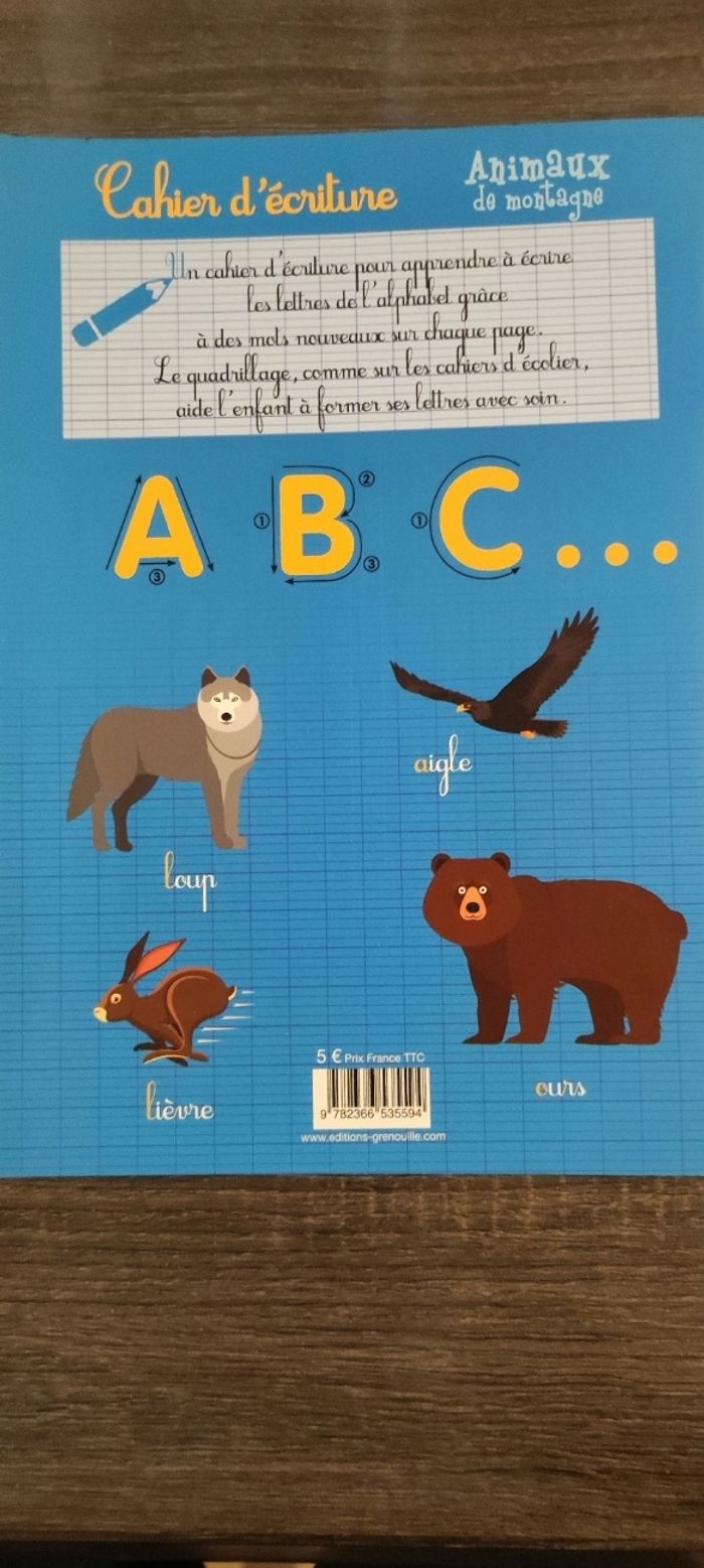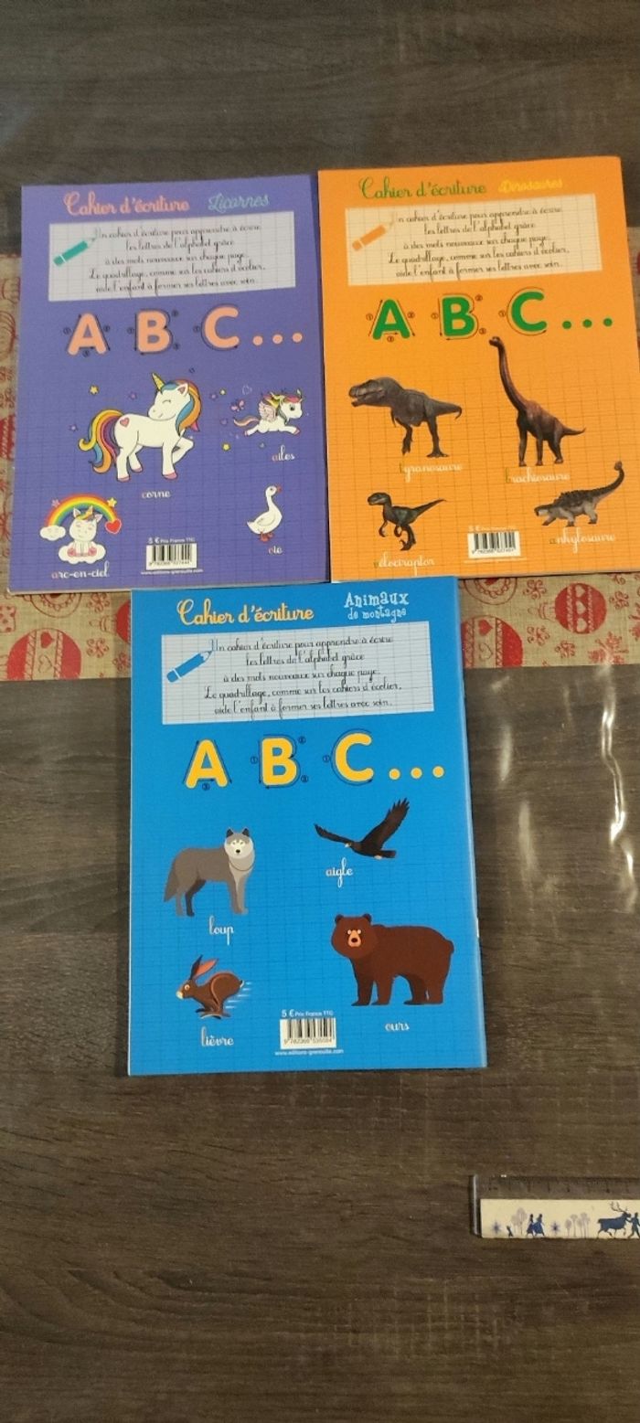 Bonjour. Voici un lot de 3 cahiers d'écriture en bon état et très peu utilisé. Il y a juste une page (cf photo) sur le cahier dinosaure qui a été utilisée et que je n'ai pas pu effacé mais il reste de la place. N'hésitez pas à me contacter pour de renseignements, de photos ou autre. A bientôt