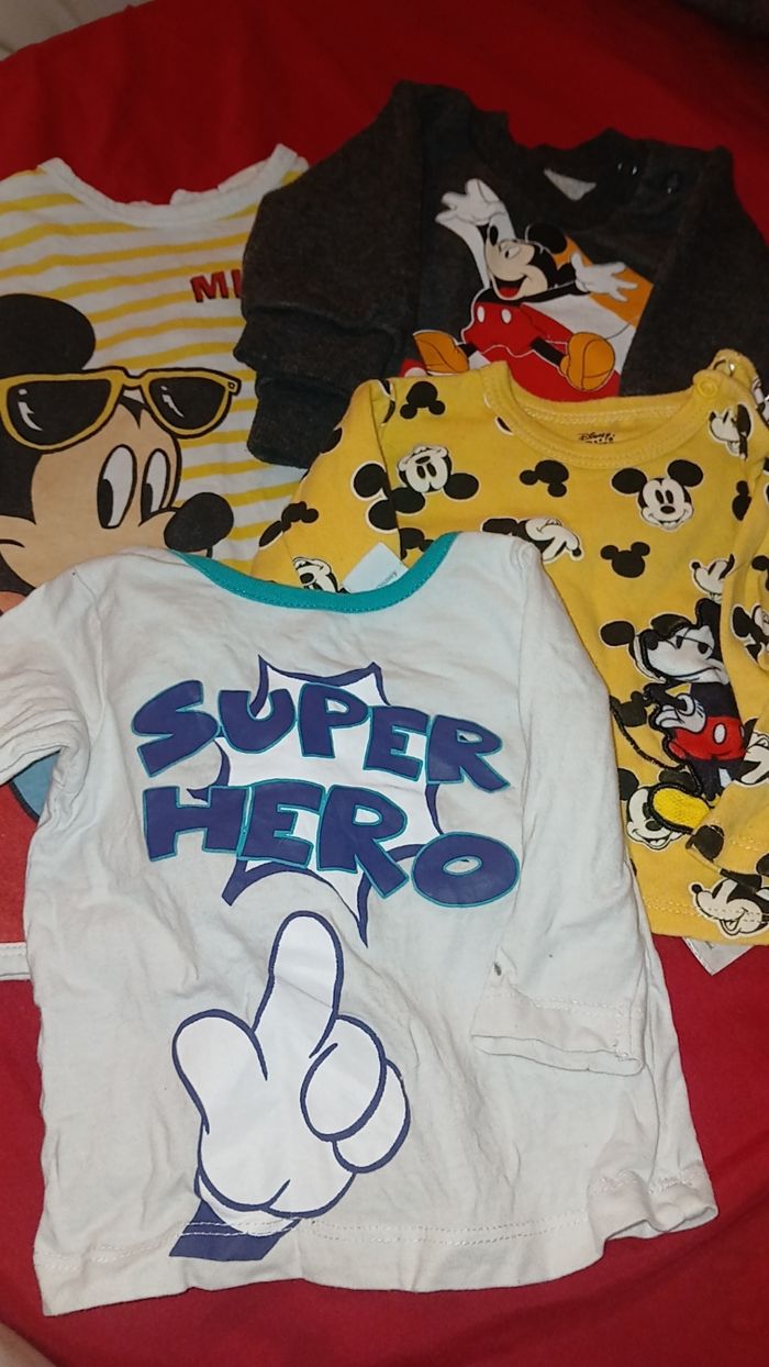 Je vend plusieurs vêtement de la marque Disney baby contenant un pull taille 0mois, 2 t-shirt manche longue taille 3mois, une combinaison short 6mois. En bonne etat