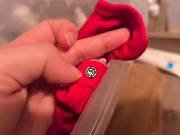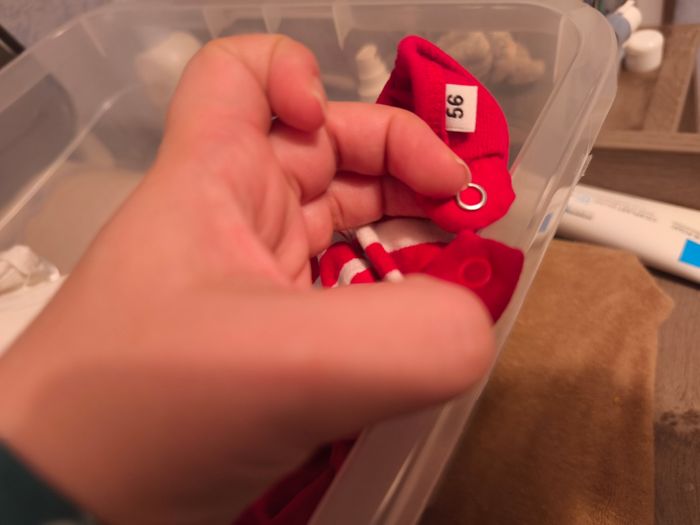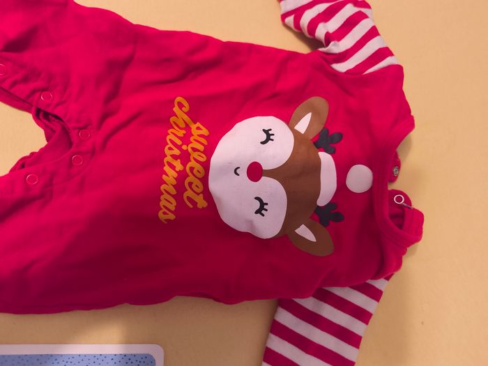 Pyjama léger thème renne de Noël. Porté 2 fois seulement mais là première pression s'est décollée et est restée attachée de l'autre côté (voir des 2 dernières photos). Facilement réparable pour quelqu'un qui sait faire mais ce n'est pas mon cas... Taille 56 cm.
