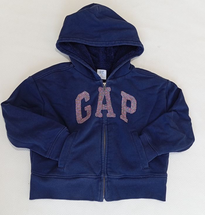 Sweat à Capuche GAP Kids Bleu Marine Fourré Lettres Paillettes Zippé Taille L (10 ans) 140 Cms - photo numéro 1