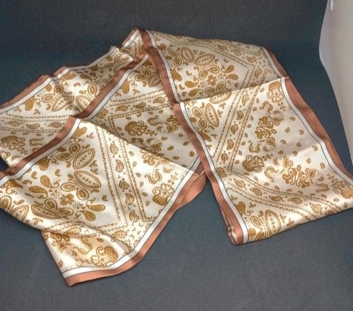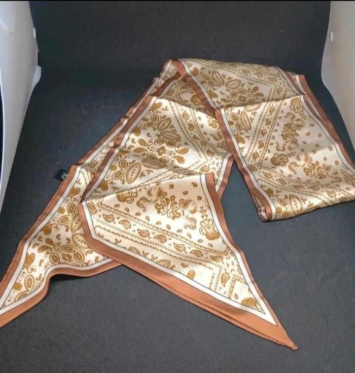 En excellent état, ce joli foulard effet satiné (100%polyester) arbore un imprimé raffiné qui s’accorde avec tous les styles. Idéal pour rehausser une tenue sobre ou ajouter une touche mode sans effort. ✨ Taille : 148cm sur 14cm ✨ Matière : effet satiné (100% polyester) ✨ État : neuf juste sorti de l' emballage pour la photo Faites vite : ce type d’accessoire part rapidement !