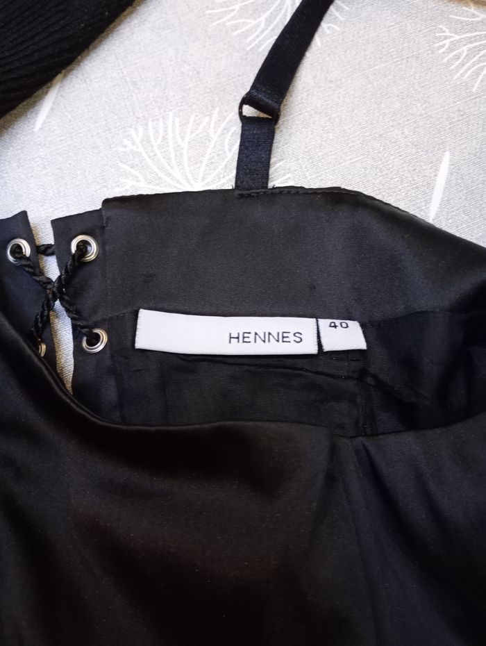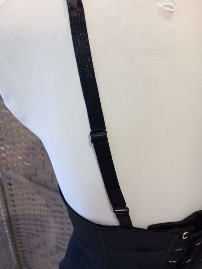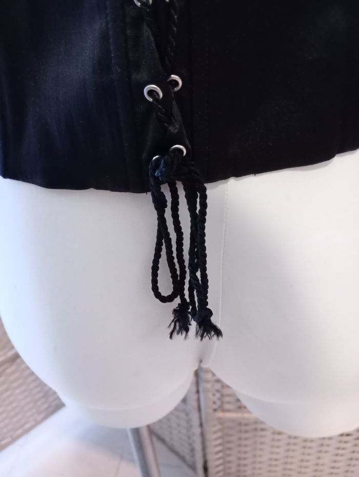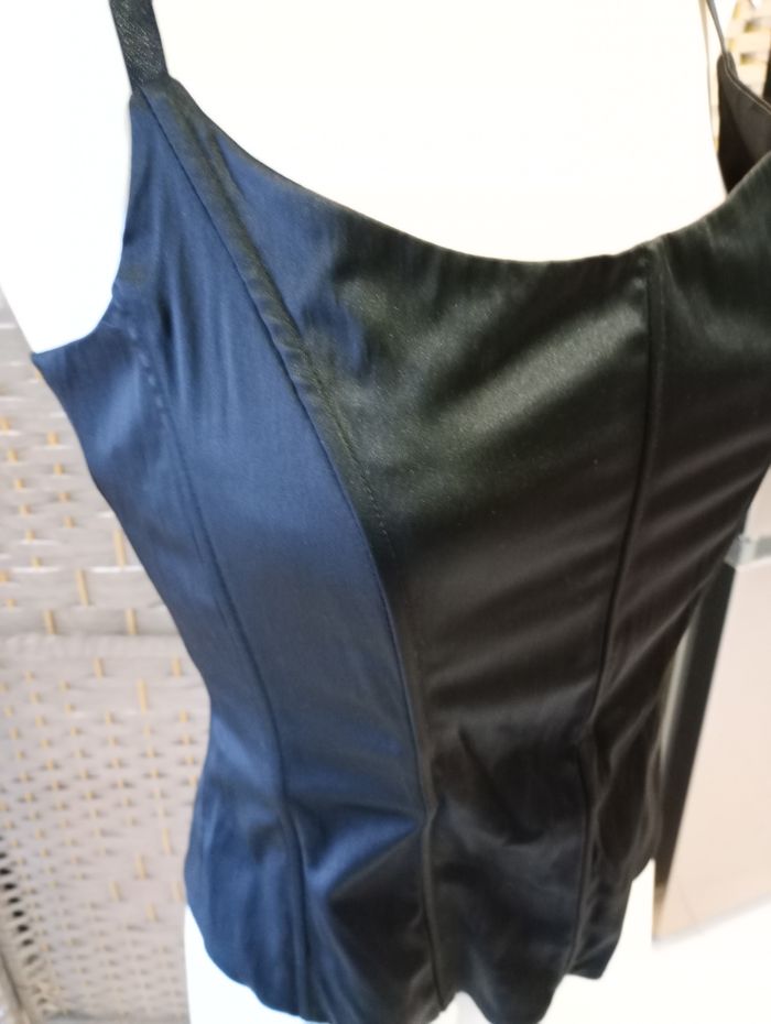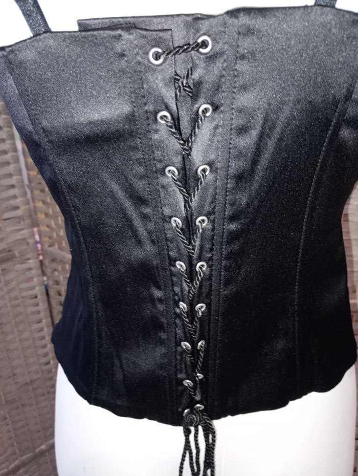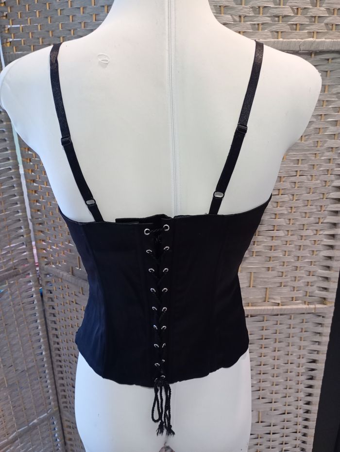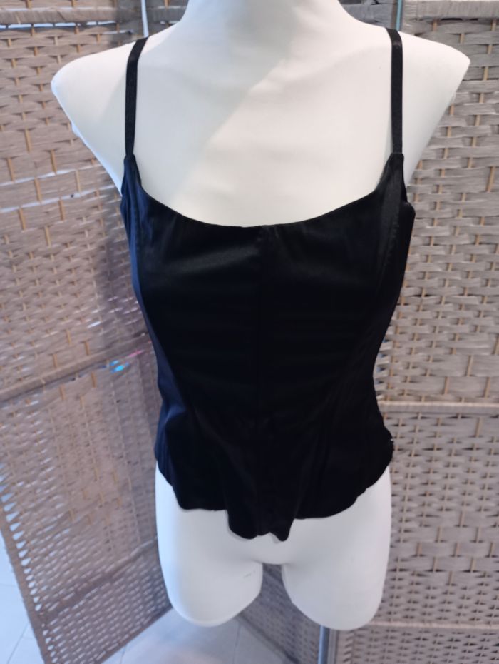 Corset effet satiné. Avec baleines. Tirette et bouton sur le côté. Laçage à l'arrière. Bretelles réglables. Taille : 40. Longueur sans les bretelles : 44 cm. Largeur entre aisselles : 39 cm. Marque : Hennes (H&M). Très bon état.